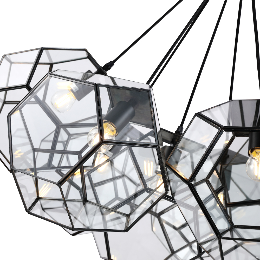 The Aurora Prism collection is a symphony of geometry and light. Featuring a sleek black frame and multifaceted clear glass panels, this collection evokes the elegance of crystalline forms suspended in space. The statement chandelier, with its clustered glass spheres, radiates modern sophistication, while the single pendant offers a refined, minimalist touch. Perfect for contemporary interiors, Aurora Prism brings a captivating balance of structure, transparency, and brilliance to any space.