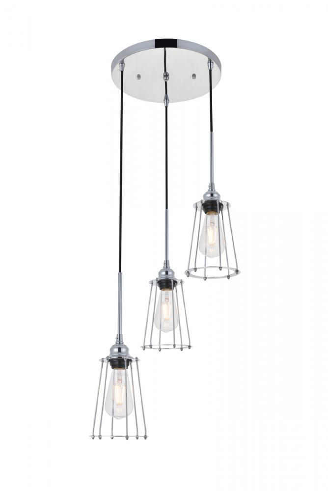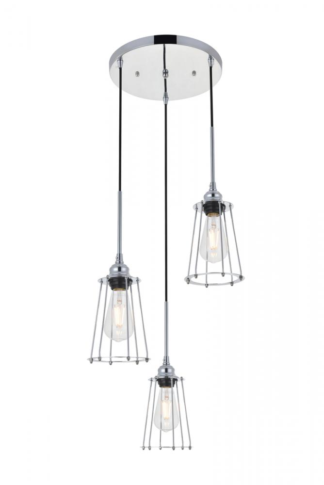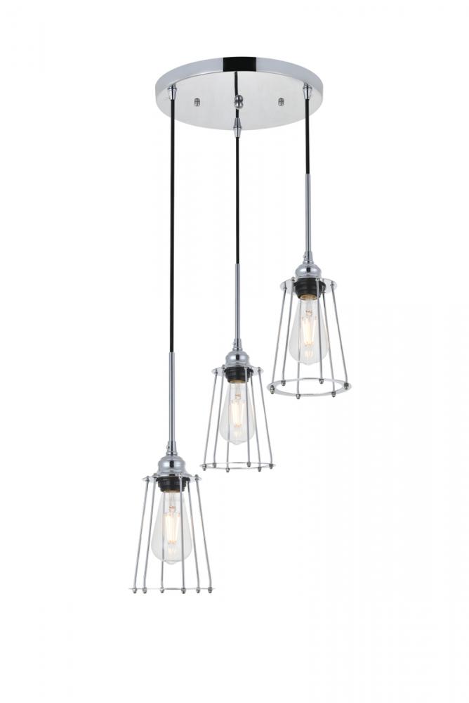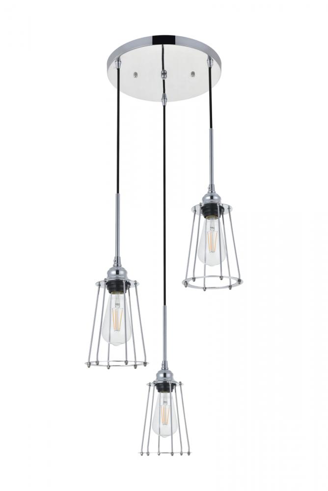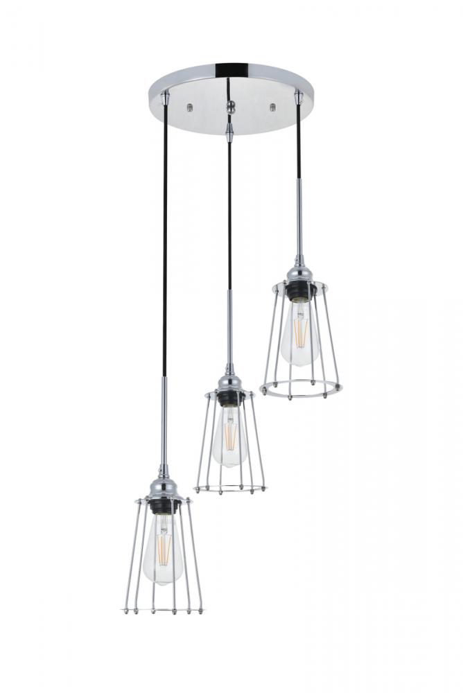 Chrome finish 3-light pendant light with a contemporary open cylinder shade suspended from a circular canopy