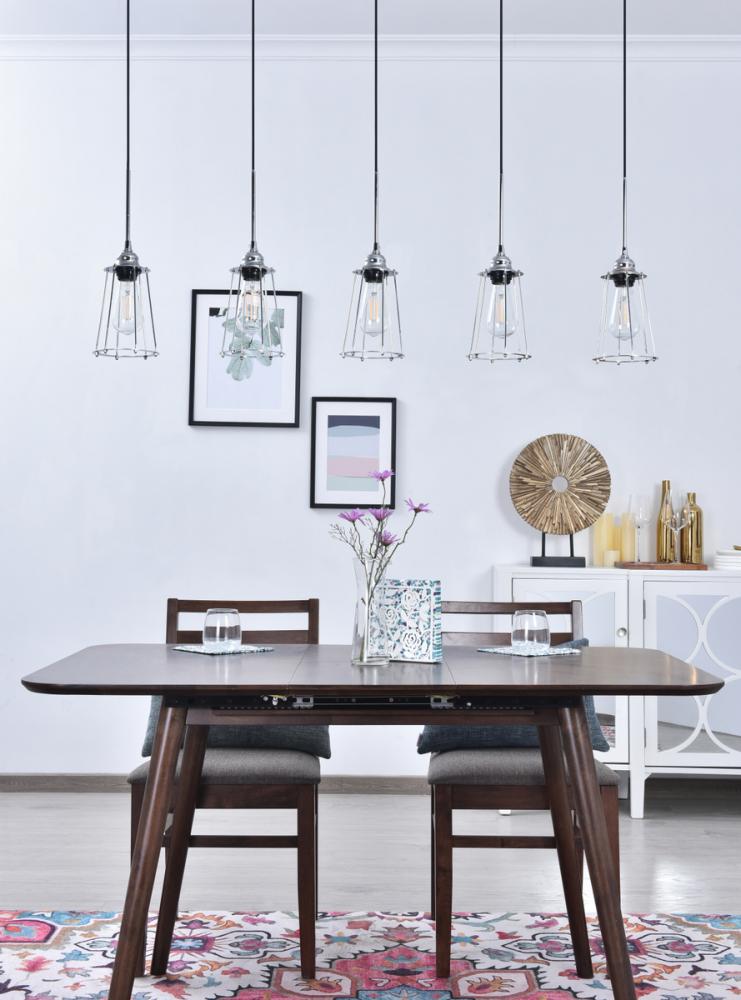 In all of its auspicious glory, the Auspice collection pendant lamp in a chrome finish will shine its felicitous light for you. As the lights pass through the open shades, they dance around with the shadows and put a spotlight in your room. Whether it is in your entryway, living room, or dining room, this row of 5-light pendant will surely please you and your guests.
