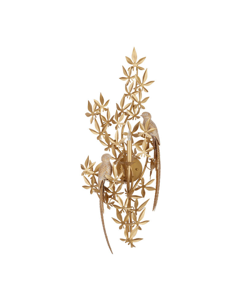 The Aviary Gold Wall Sconce, Right, is a gleaming example of sophisticated biophilic design. Inspired by an antique fixture, the very tall sconce at 34.5 inches high has flowing leaf and floral motifs in a Swedish Gold finish. The Gustavian-inspired color matches the tails of birds perching within the foliage. Originally carved by a sculptor, they were carefully recreated out of composite to match the original works of art. The single bulb is dimmable.