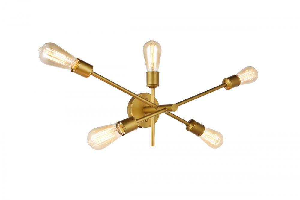 Modern sophistication with a jaunty presentation. Axel wall lamps feature five arms intersecting an oval base at different points to direct light in any direction. A total of five light sources (bulbs not included) promises utility in a variety of applications from hallway to accent lighting. The absence of shades says industrial; the design says penthouse. The smooth steel hardware is finished in austere black with soft bronze sockets, adding a bit of tradition. Stylish and cutting-edge without being too eccentric.