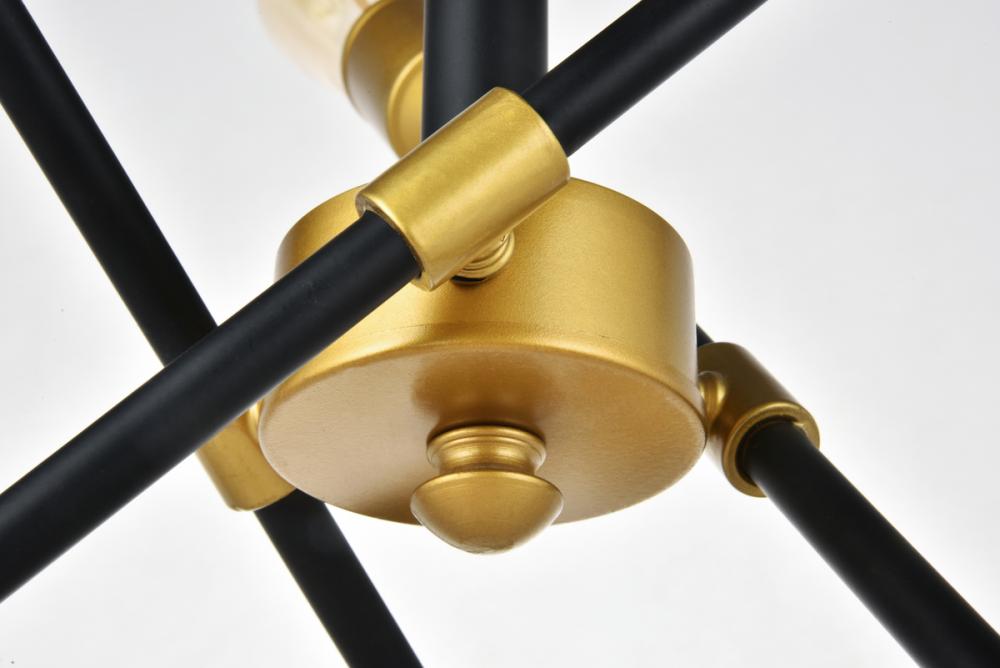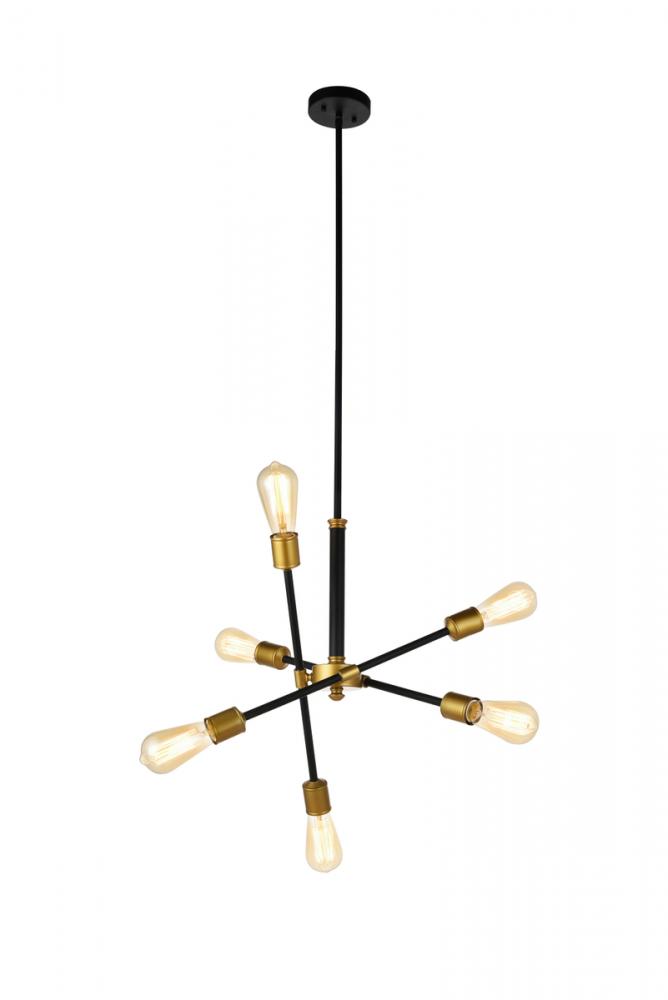 Modern sophistication with a jaunty presentation. This Axel pendant features three adjustable crossing arms mounted on a central rod to direct light in any direction. A total of six light sources (bulbs not included) in a compact design offers functional beauty in smaller spaces. The absence of shades says industrial; the design says penthouse. The smooth steel hardware is finished in austere black with soft bronze sockets and canopy, adding a bit of tradition. Stylish and cutting-edge without being too eccentric.