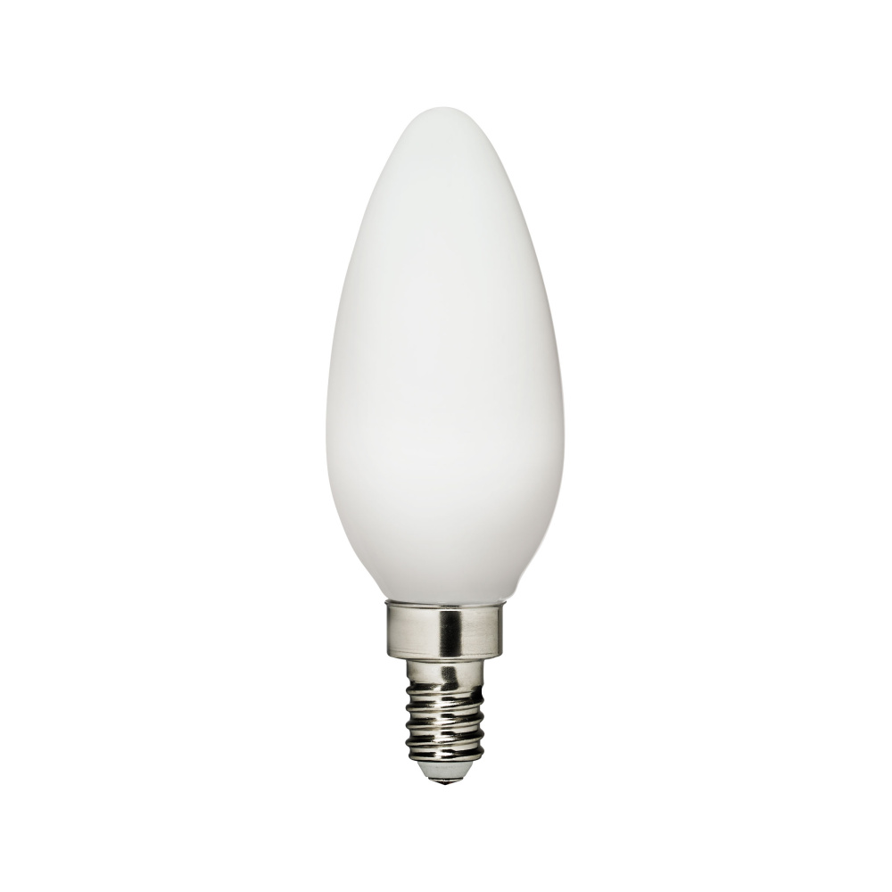 Frosted B11 5W LED bulb emitting 500 lumens of soft 2700K light; perfect for ambient lighting.