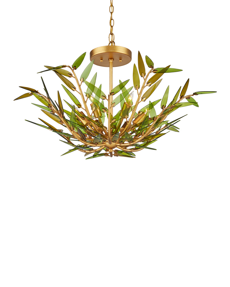 The Babylon Pendant/Semi-Flush is formed from slender, curving stems of wrought iron in a contemporary gold leaf finish that have been shaped into an elegant floral silhouette. The tapering spikes are adorned with elongated green glass leaves, each hand-cut from recycled wine bottles, that look as if they are being stirred by a breeze. The edges are individually polished by hand and placed on the frame with metal pins that resemble the shapes of the glass pieces. There will be slight variations in color in the leaves on this six-light pendant that is dimmable and convertible to a semi-flush. Adjustable from 15" to 91" with use of included chain/rod kit/cable. If your space calls for a longer drop, additional chain/rods/cable is available for purchase.
