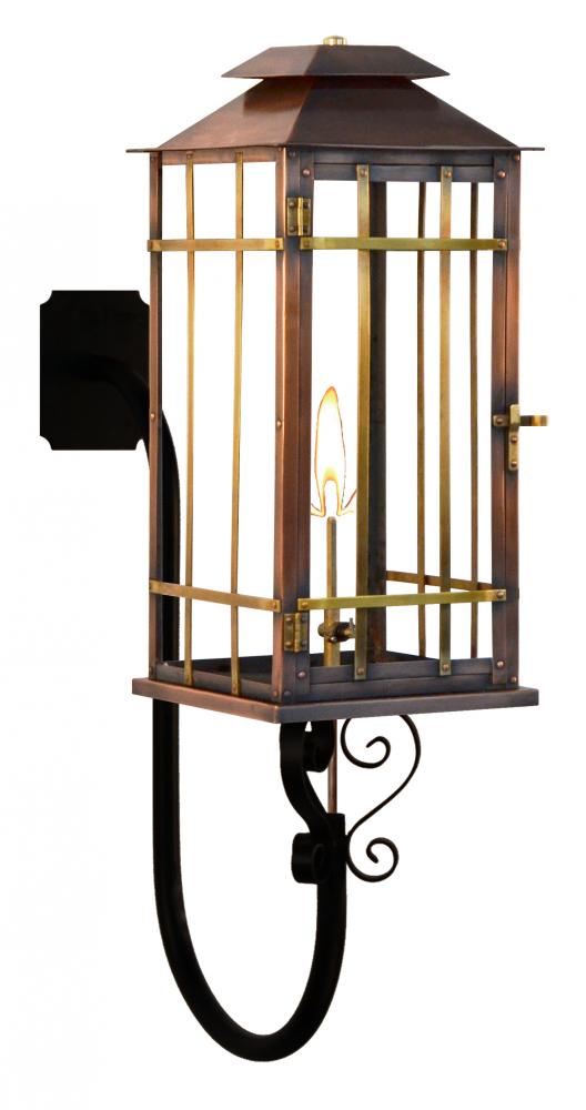 Size 18 Gas Copper Lantern, single gas burner, standard with Coach House Bars, with Gooseneck with S-Scrolls