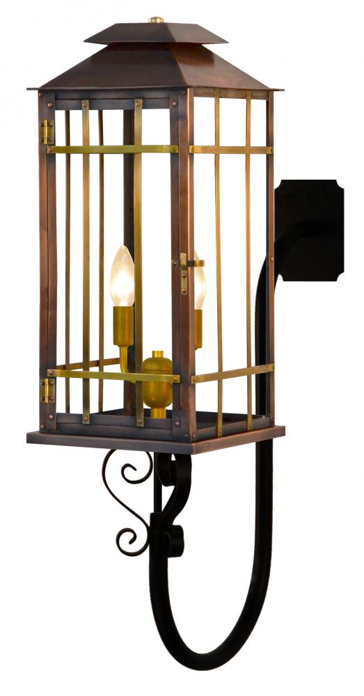 Size 22 Electric Copper Lantern, 2 candelabra base sockets, standard with Coach House Bars, with Gooseneck with S-Scrolls