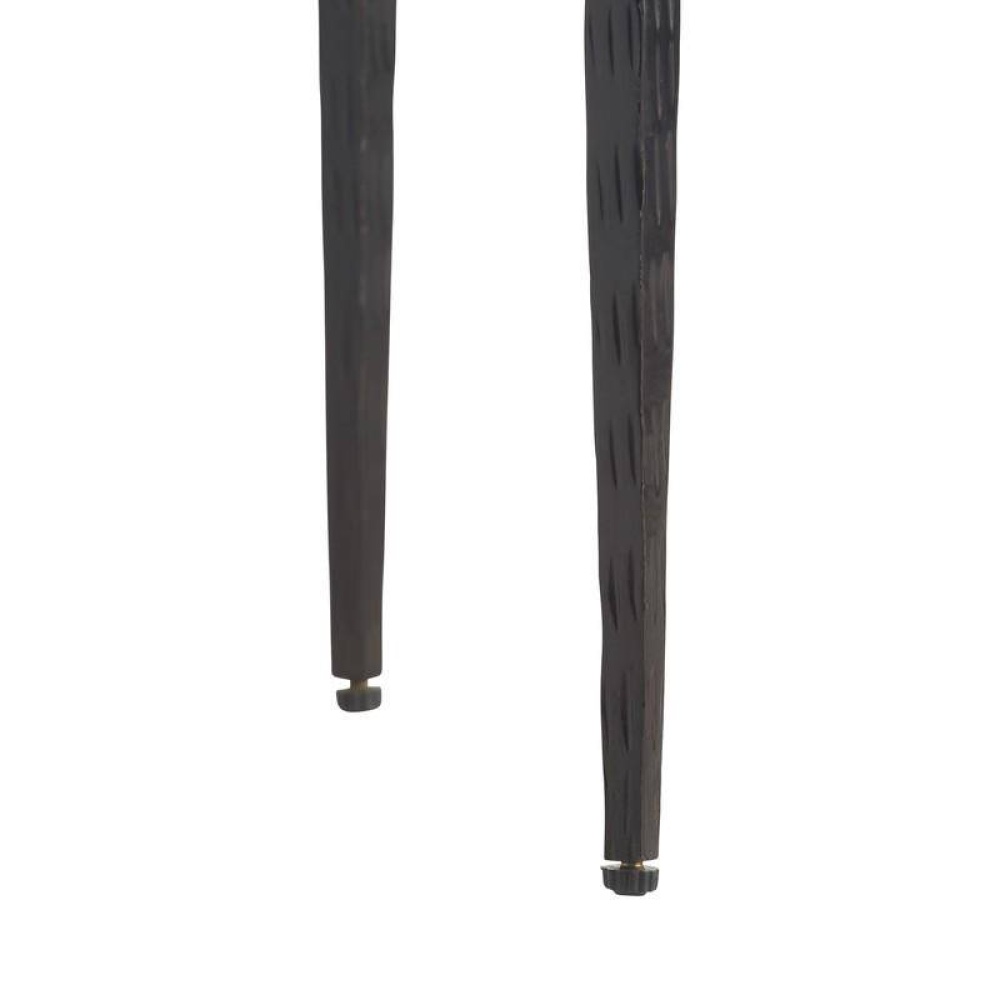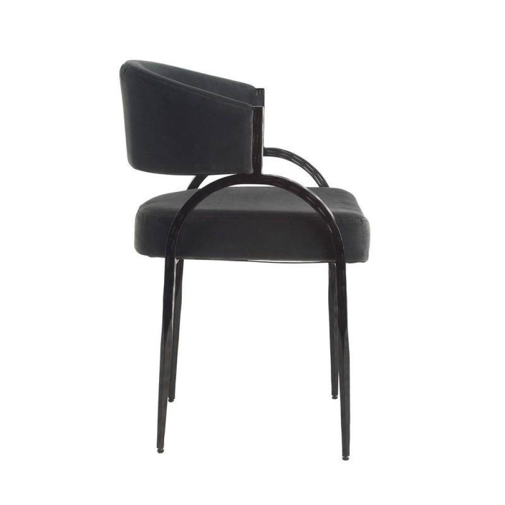 A curved back and large seat rest on a perfectly poised silhouette to compose the foundation of the Bahati. Natural iron has been hand-forged, yielding delicate details along its thin frame. The seat and back cushion are covered in a midnight grey performance velvet, allowing this piece to perform easily alongside existing décor. For a matte finish on the legs, lightly brush the iron with a Scotchbrite pad to take down the sheen.
