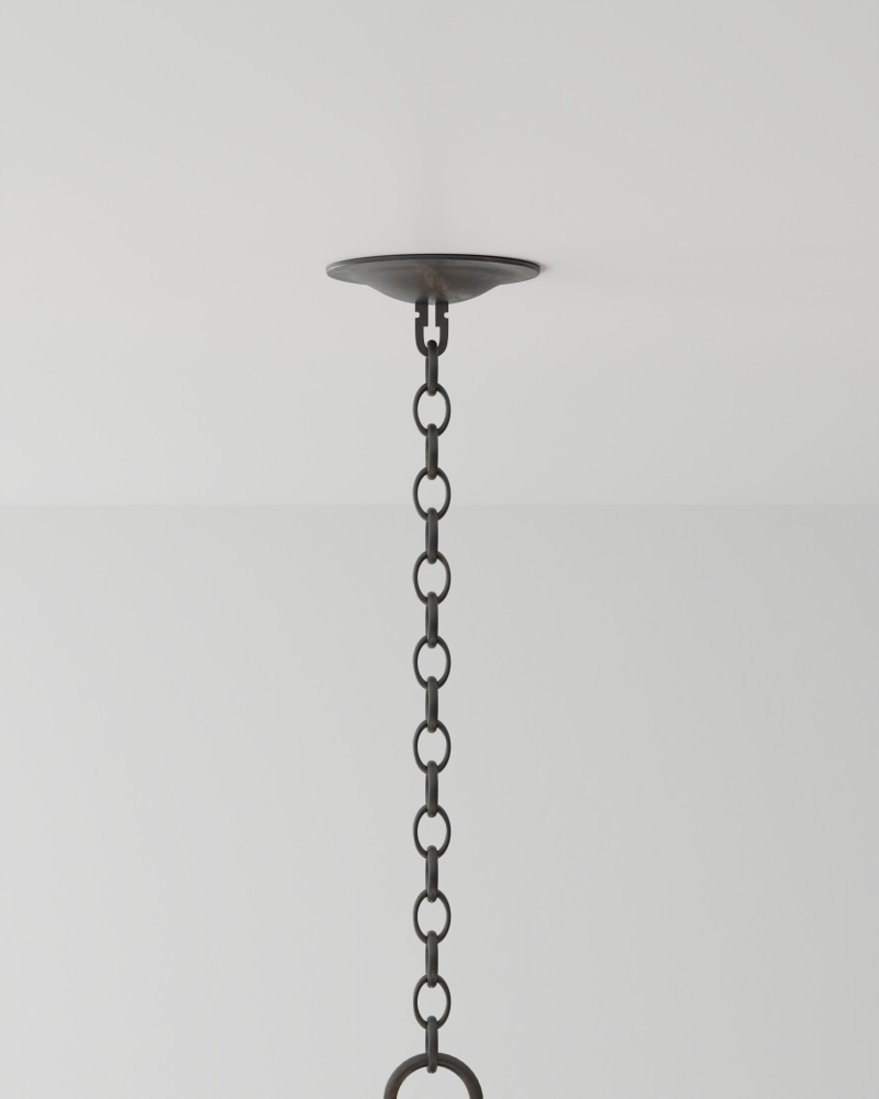 In the Bunny Williams collection, the Bailey Chandelier is a large chandelier with a two-tone finish: contemporary gold leaf on the interior and French black on the exterior. Ambient light radiates between the ribbons of wrought iron in a warm glow due to the gold interior. The black chandelier has six lights so that glow is abundant. Adjustable from 28" to 96" with use of included chain/rod kit/cable. If your space calls for a longer drop, additional chain/rods/cable is available for purchase.