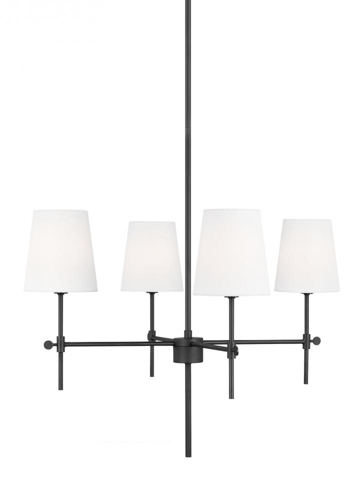 The Baker four light single tier chandelier in midnight black provides abundant light to your home, while adding style and interest. A lantern-like design with curved arms connecting to a cube-shaped frame
