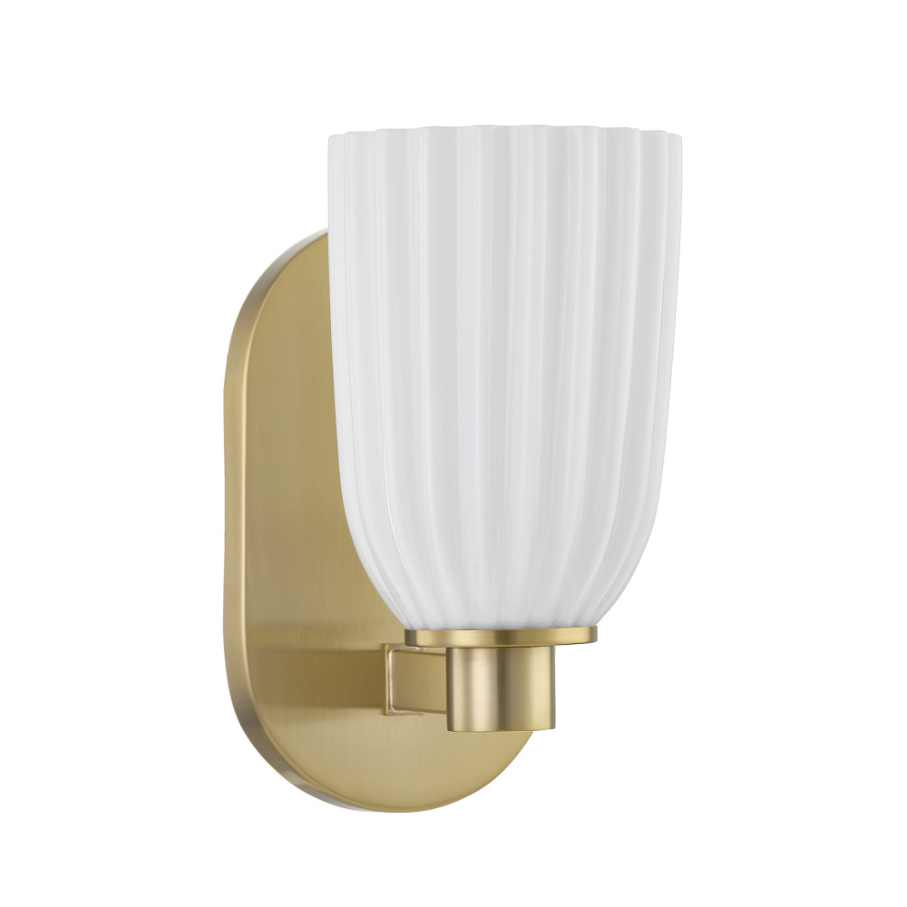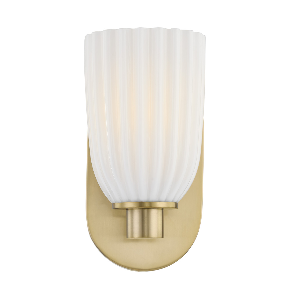 The Savoy House Baldwin 1-light sconce adds a polished touch with its Noble Brass finish and single ribbed opal glass shade that radiates gentle, even light. Its understated profile makes it a versatile choice for countless spaces. Baldwin is 8.75" in height, 4.5" in width and extends 6.25" from the wall. It uses one standard size bulb of up to 60 watts. Bulb not included. Damp area rated.