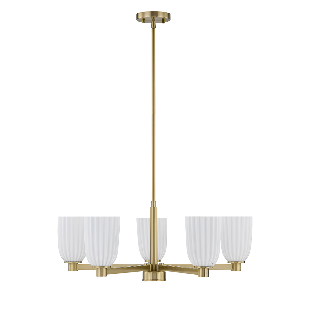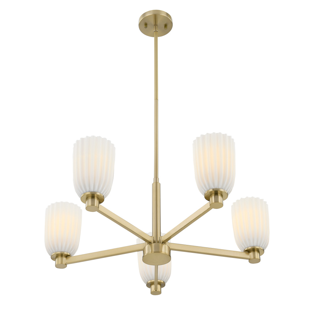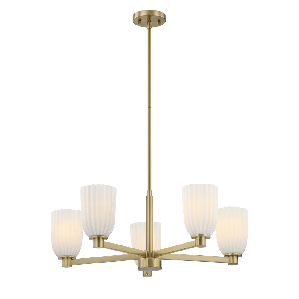 The Savoy House Baldwin 5-light chandelier offers a fresh, effortless take on modern elegance. A Noble Brass finish brightens the streamlined frame while ribbed opal glass shades lend gentle texture and inviting ambiance. Baldwin is 11.5" in height and 28" in width. It uses five standard size bulbs of up to 60 watts per bulb. Bulbs not included. Includes four 12" downrods and one 6" downrod.
