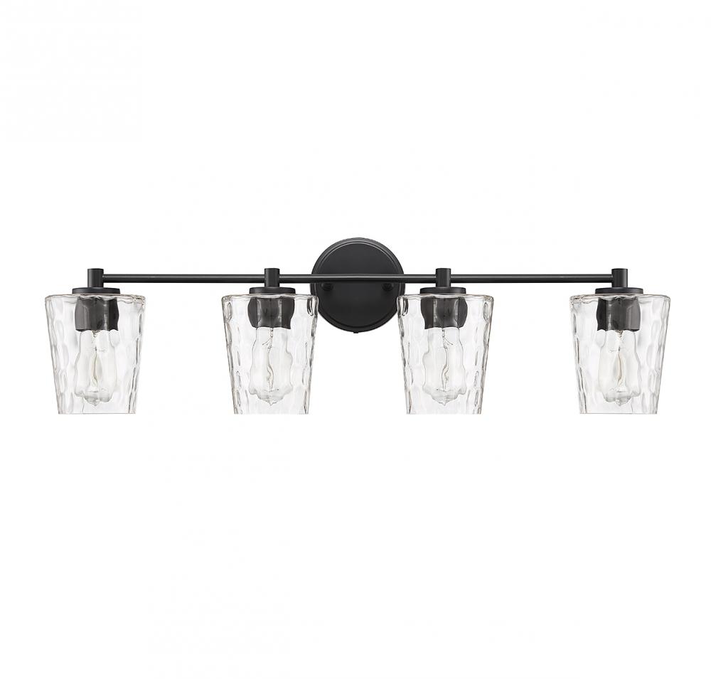 Add a hint of nature-inspired style to your bathroom with the Savoy House Ballas 4-light bath vanity light. Clear hammered glass shades give a watery effect for extra intrigue and dimension. Black finish. Ballas is 9.75" in height, 31.5" in width and extends 6.5" from the wall. It uses 4 standard size bulbs of up to 60 watts per bulb (bulbs not included).