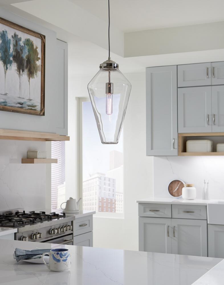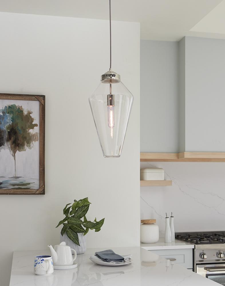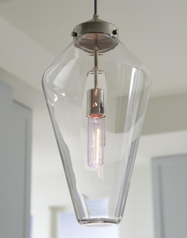 The Ballina collection of pendants are defined by their large, clear shapely glass shades. These stand-out pendants work well alone and even better in groups. A polished nickel finish and silver hanging wire complete Ballina's modern design.