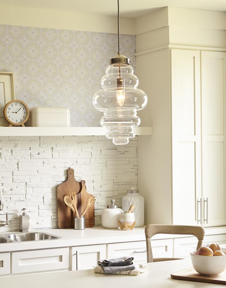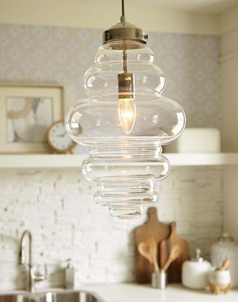The Ballina collection of pendants are defined by their large, clear shapely glass shades. These stand-out pendants work well alone and even better in groups. A polished nickel finish and silver hanging wire complete Ballina's modern design.