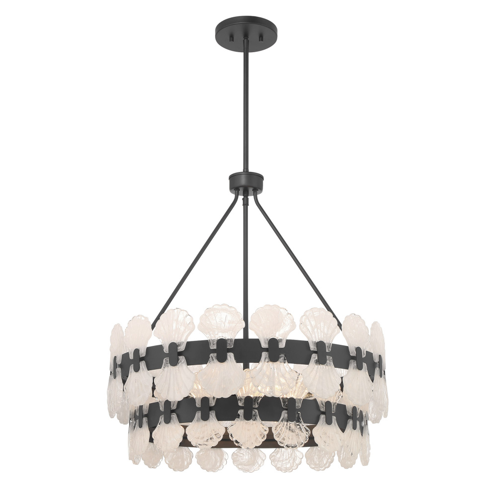 In the Bancroft 5-light chandelier from Savoy House, coastal charm is given a stylish upgrade! Its design is finished in bold Matte Black and decorated with shell shapes crafted from mesmerizing strie glass. Bancroft is 27" in height and 24" in width. It uses five candelabra size bulbs of up to 60 watts per bulb. Bulbs not included. Comes with four 12" downrods and one 6" downrod.