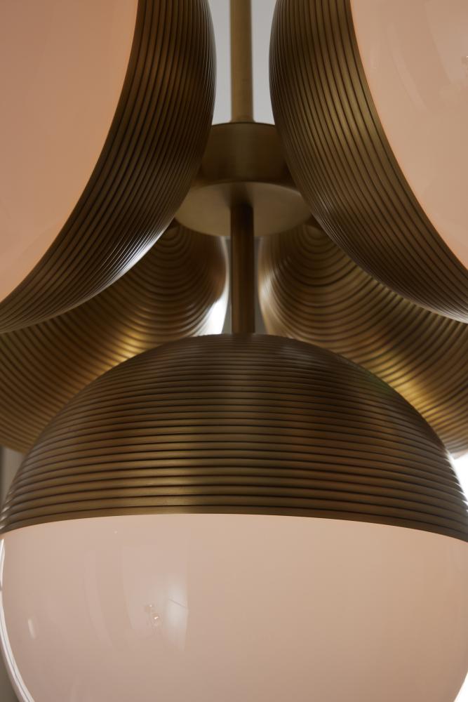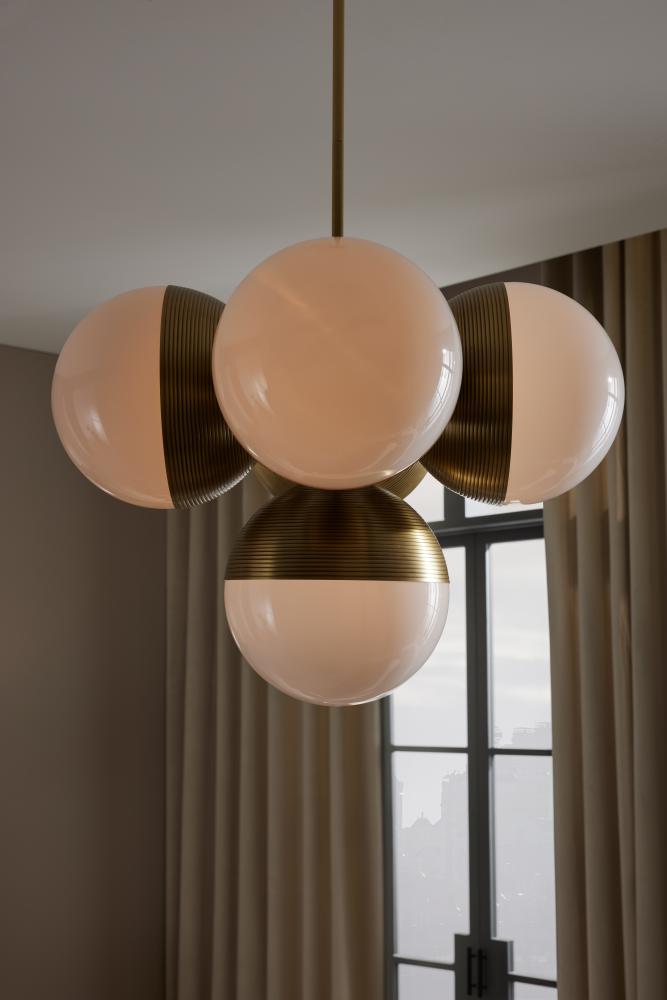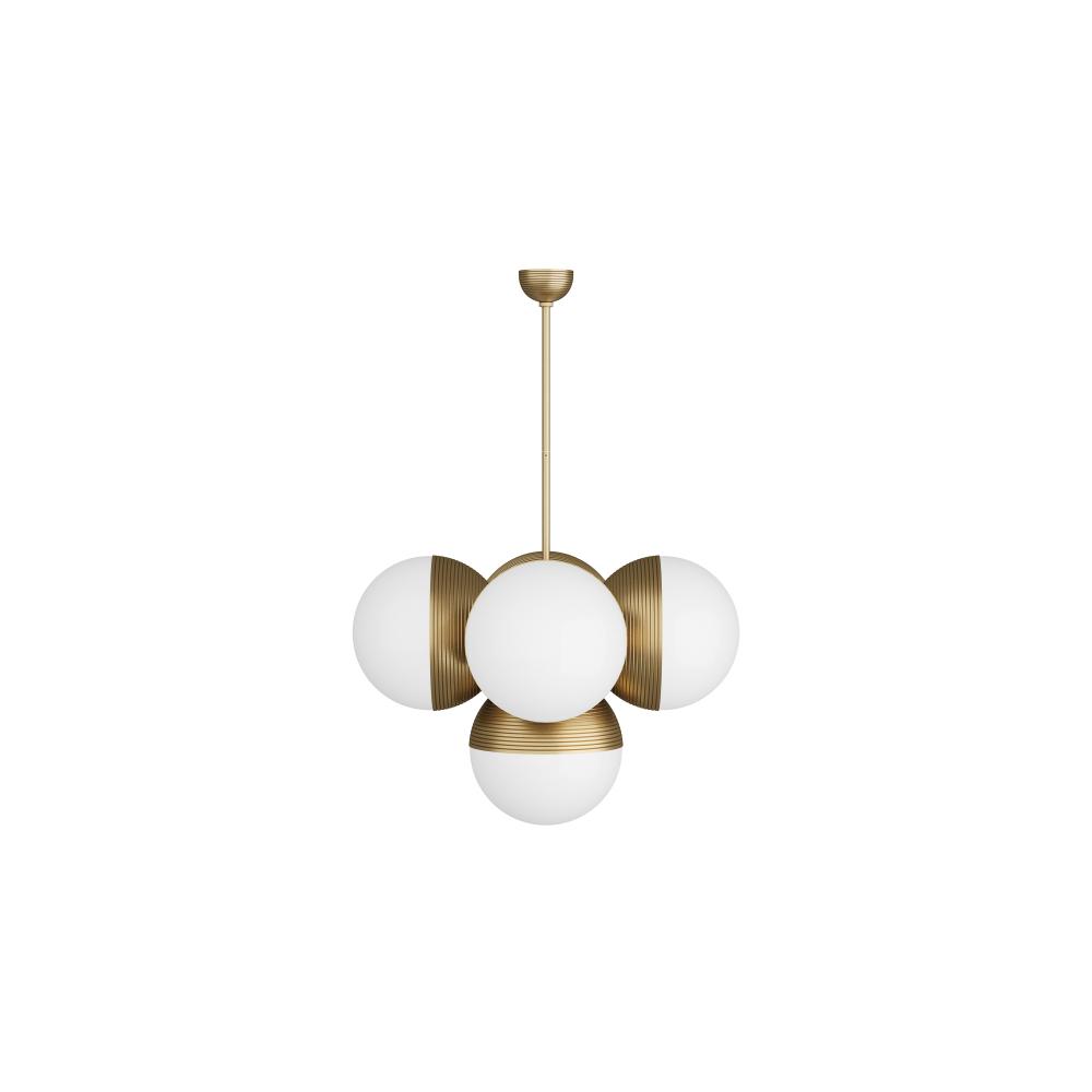 A mid-20th century European interpretation of antique street lights, the five-light Baptiste adds a hint of sophisticated playfulness to any abode. Five globes of opal glass are suspended in antique brass over iron settings to add illumination to every corner. Damp-rated, although limited covered outdoor conditions may affect finish. Finish will vary.