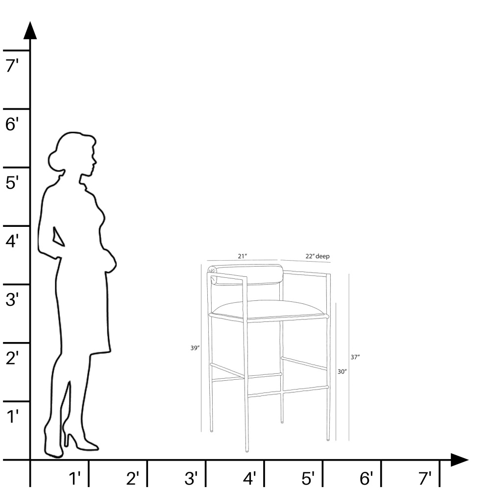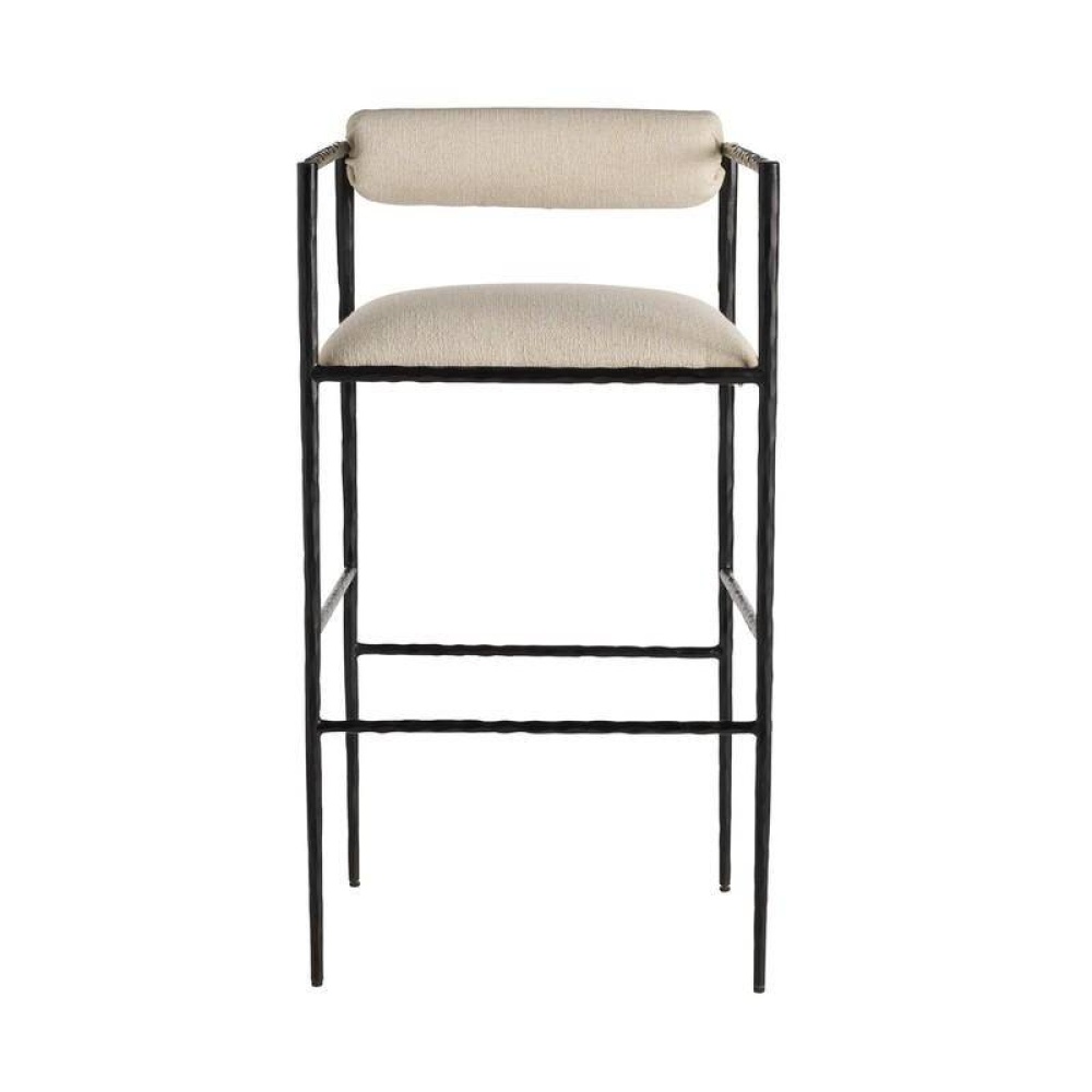 This exquisite bar stool is perfectly poised, perched on delicate legs recalling an insect. A body of natural iron is hand-forged to yield soft impressions along its sharp-angled frame. The tight seat and bolster back are covered in performance fabric in Oxford white. Finish will vary.