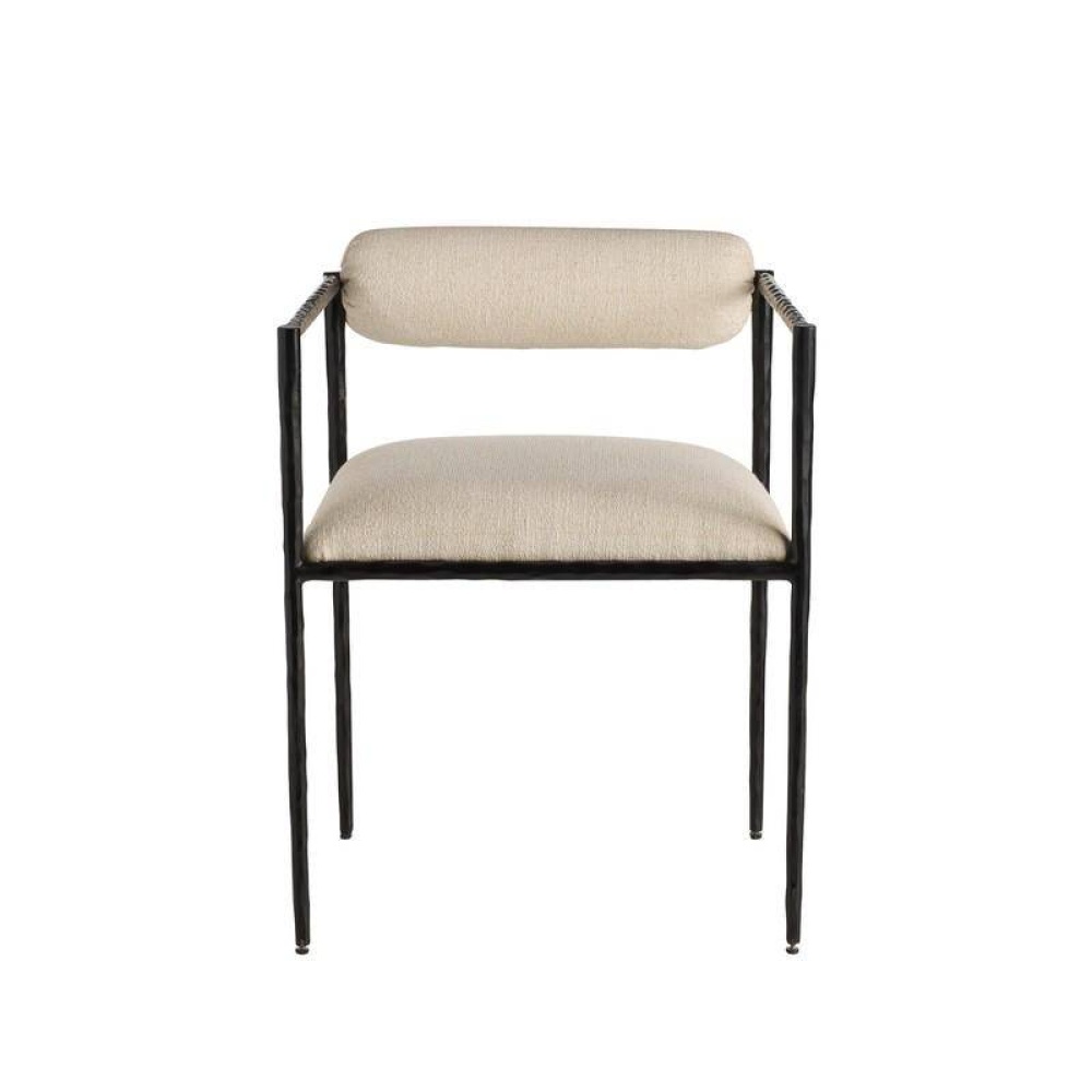 This exquisite frame is perfectly poised, perched on delicate legs recalling an insect. A body of natural iron is hand-forged to yield soft impressions along its sharp-angled frame. The tight seat and bolster back are covered in performance fabric in Oxford white. Finish will vary.