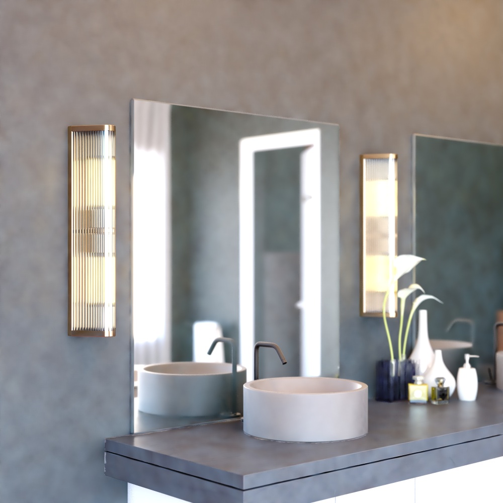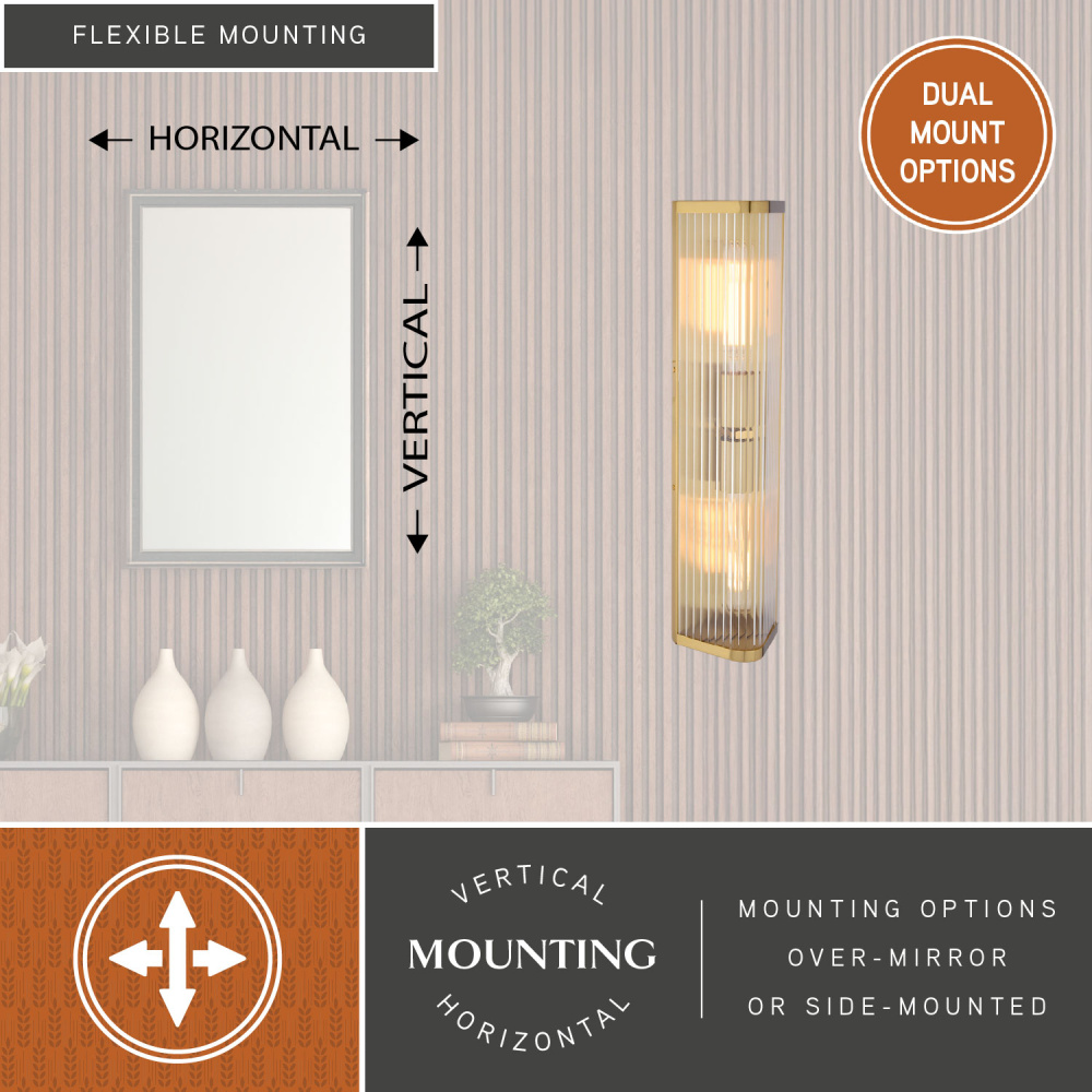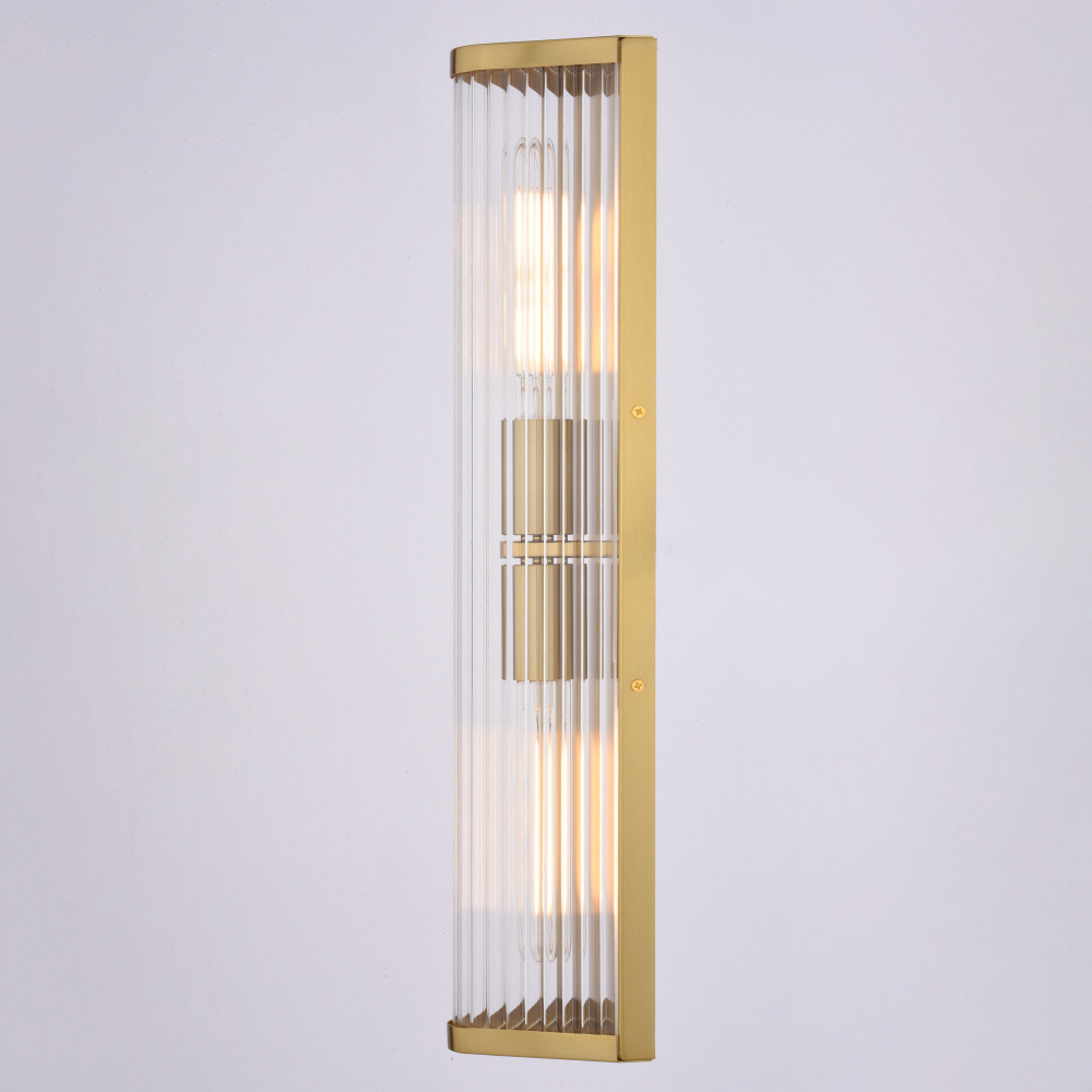 The Barbier wall light seamlessly blends art deco inspiration with modern functionality. Key features include two lights for ample and balanced illumination, a clear ribbed glass shade that adds texture and visual interest, and a sleek gold finish for a touch of contemporary sophistication. Its versatile design is suitable for bathrooms, hallways, or powder rooms, and its triangular shape sets it apart from typical wall lights making it a standout piece for your home.