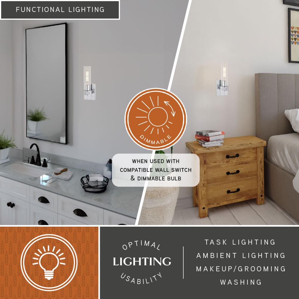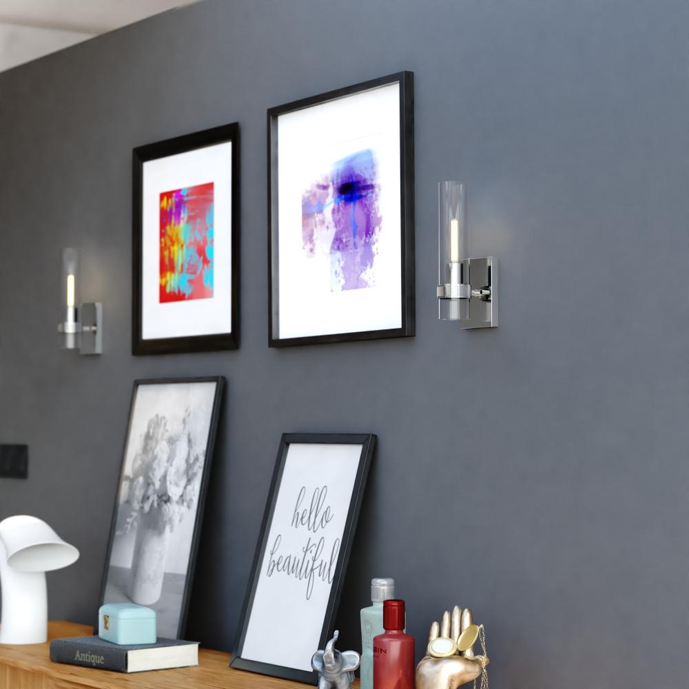 The Bari collection is a blend of simplicity and sophistication featuring a contemporary knurled ring. Ample light emanates from the elongated clear glass shade creating a dramatic effect. Pair with a clear filament bulb for the optimal look. This damp rated wall sconce is ideal for bathrooms, hallways, stairways, and bedrooms.