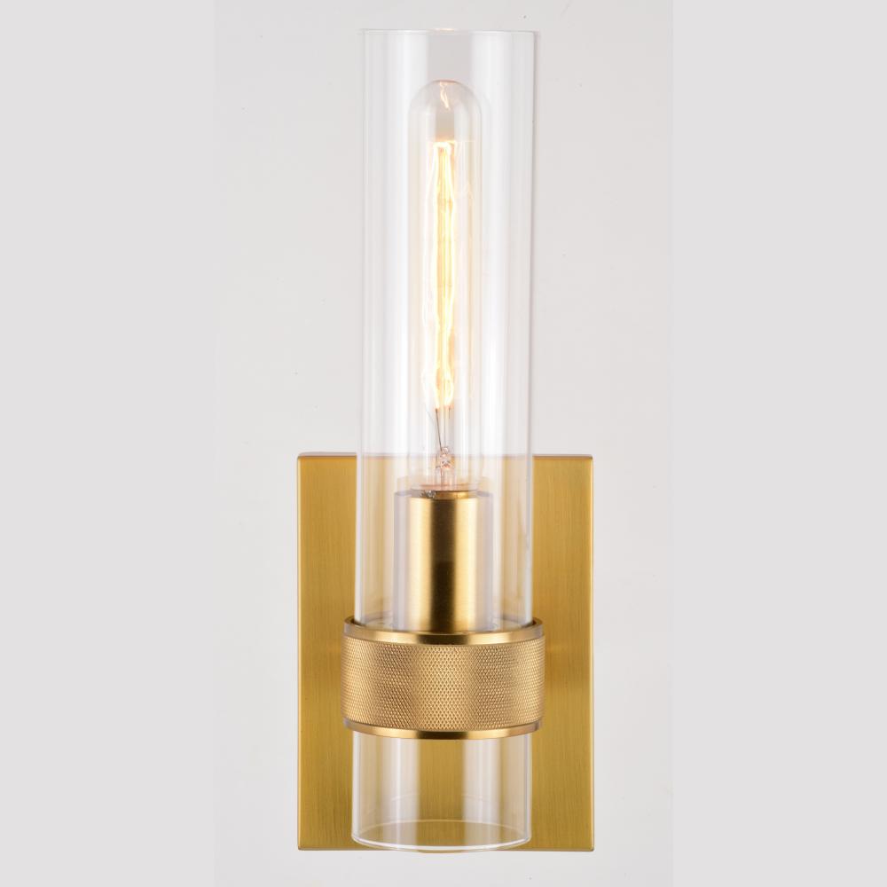 The Bari collection is a blend of simplicity and sophistication featuring a contemporary knurled ring. Ample light emanates from the elongated clear glass shade creating a dramatic effect. Pair with a clear filament bulb for the optimal look. This damp rated wall sconce is ideal for bathrooms, hallways, stairways, and bedrooms.