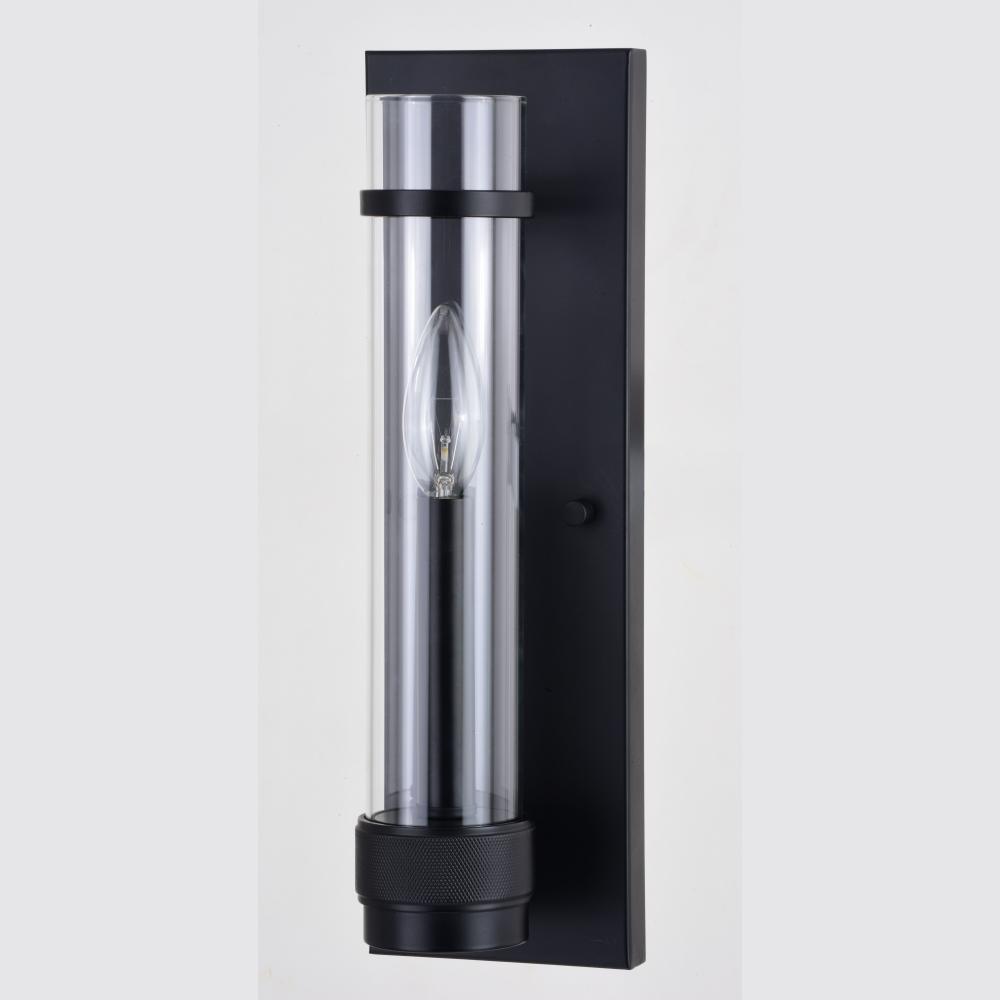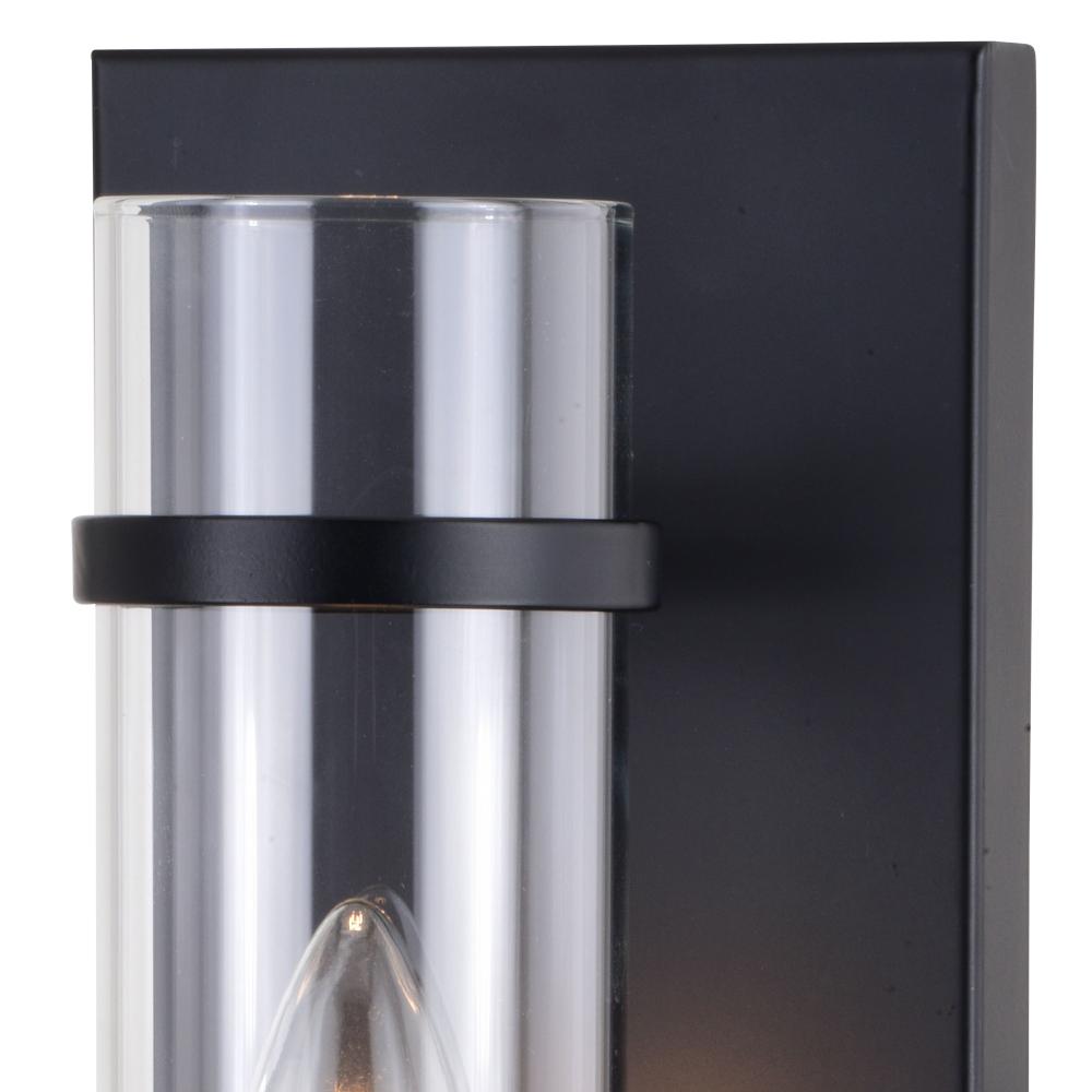 The Bari collection is a blend of simplicity and sophistication featuring a contemporary knurled ring and a full back plate. Ample light emanates from the elongated clear glass shade creating a dramatic effect. Pair with a clear filament bulb for the optimal look. This damp rated wall sconce is ideal for bathrooms, hallways, stairways, and bedrooms.