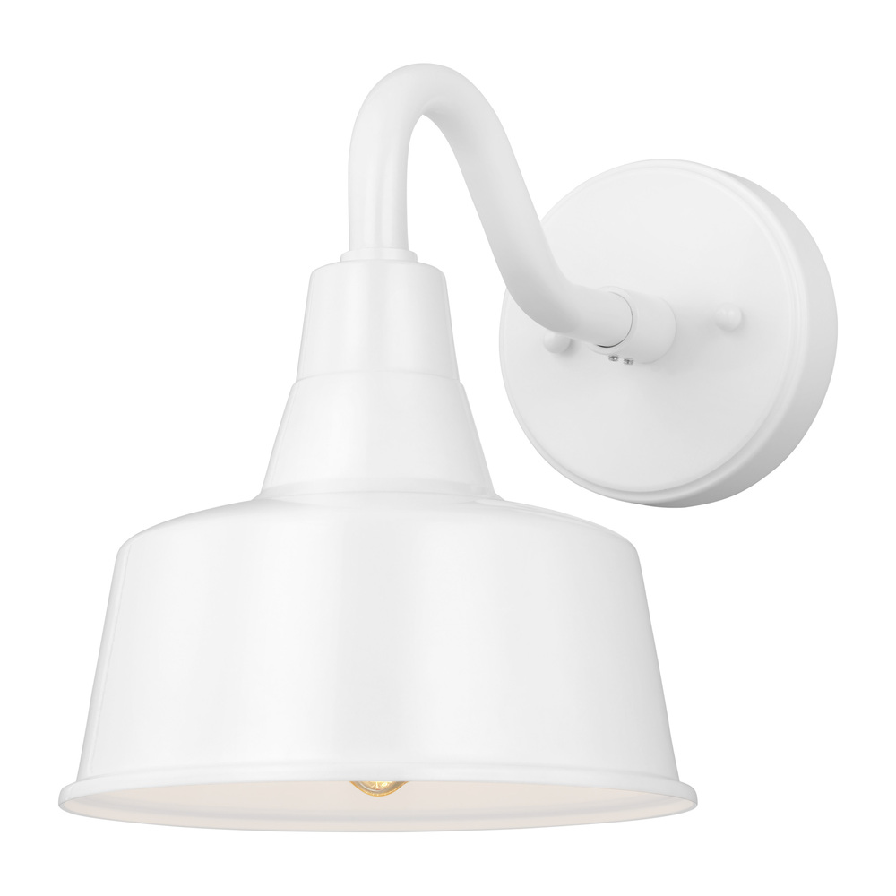 The Barn Light one light outdoor wall fixture in white enhances the beauty of your property, makes your home safer and more secure, and increases the number of pleasurable hours you spend outdoors. The classic Barn Lights are hand crafted in aluminum and coated in a Galvanized or Blacksmith finish. Ideal for large or heavily trafficked outdoor areas that need plenty of downward directed light. The oversized Barn Lights make great accents to any commercial lighting plan or residential garage entry, shed, or patio. To customize your look, a 6" extender is included with every fixture. Also available as Dark Sky with four size options to choose from.