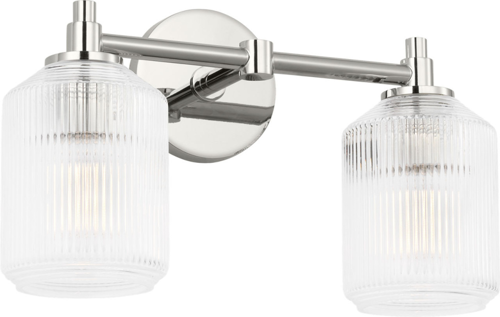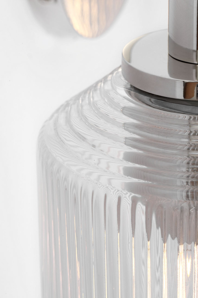 Inspired by a vintage piece of factory glass, the Barstow 15" Vanity by Chapman & Myers balances industrial heritage With modern refinement. The ribbed clear glass shade, defined by vertical and horizontal cuts, offers a jewel-like texture that catches and diffuses light With elegance. A streamlined metal frame enhances the fixture’s clean lines, making the 15" profile perfect for single vanities, guest bathrooms, or layered installations. Barstow’s thoughtful detailing and timeless simplicity elevate everyday interiors With subtle architectural presence.