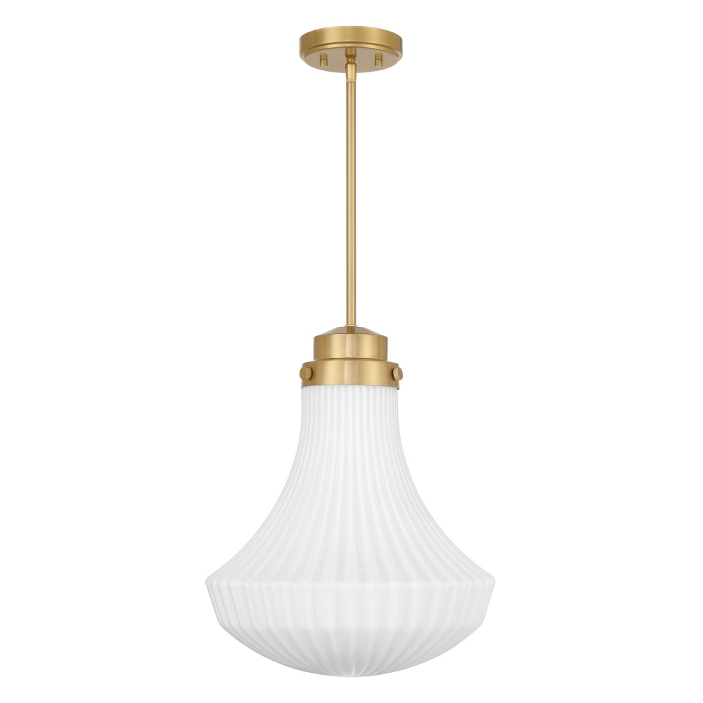 With a curving shade of white ribbed glass and a rich Warm Brass finish, the Savoy House Bartlet 1-light pendant will bring a touch of vintage charm to any space! Bartlet is 17" in height and 14" in width. Comes with four 12" downrods and one 6" downrod. It uses one standard size bulb of up to 60 watts. Bulb not included.
