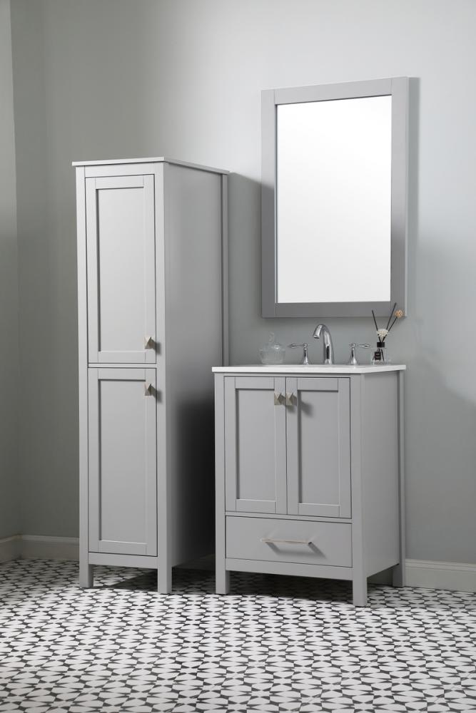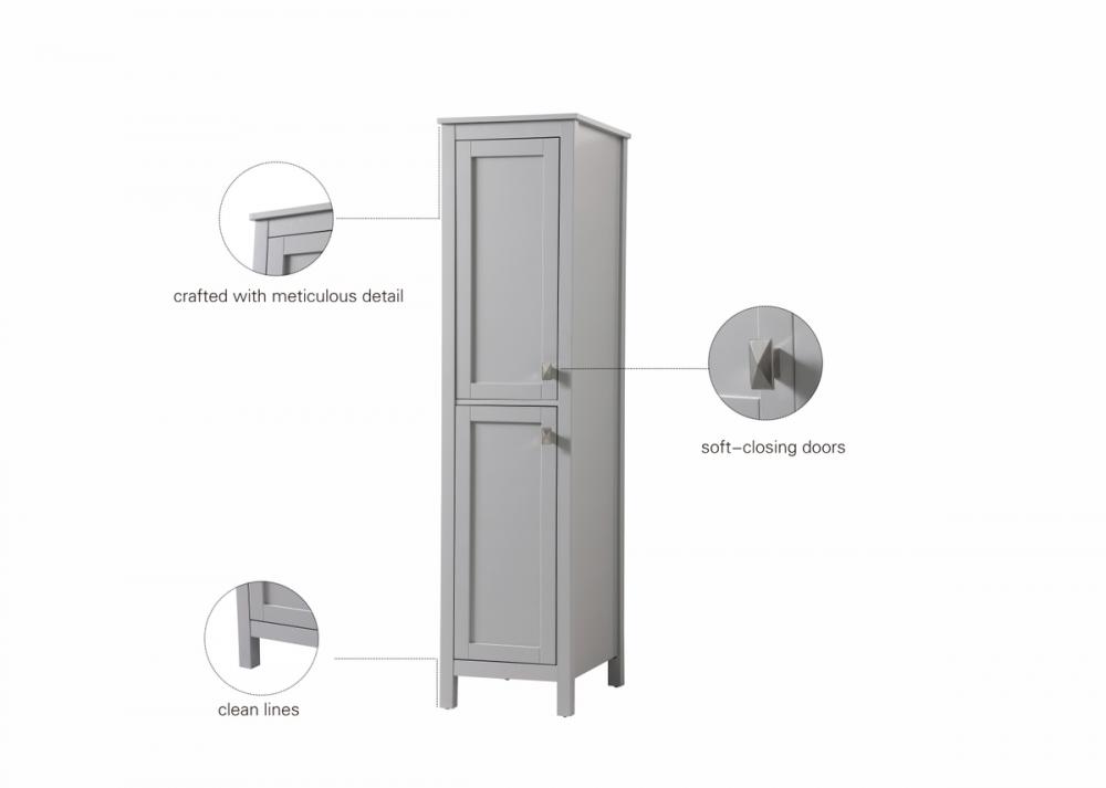 Discover enhanced storage possibilities with our linen storage cabinet, a perfect blend of compact design and ample space, measuring 16" W x 65" H x 22" D. Crafted from durable engineered wood, this cabinet features a sophisticated design including upper and lower doors, crown molding, shaker legs, and zinc hardware, exuding timeless elegance. The top and bottom cabinets equipped with adjustable shelves provide substantial room for toiletries, towels, and more. Experience versatility, convenience, and tranquility with soft-close doors and two adjustable shelves. Arriving fully assembled, it streamlines setup, while various finishes and sizes seamlessly integrate with our bathroom vanity collection.