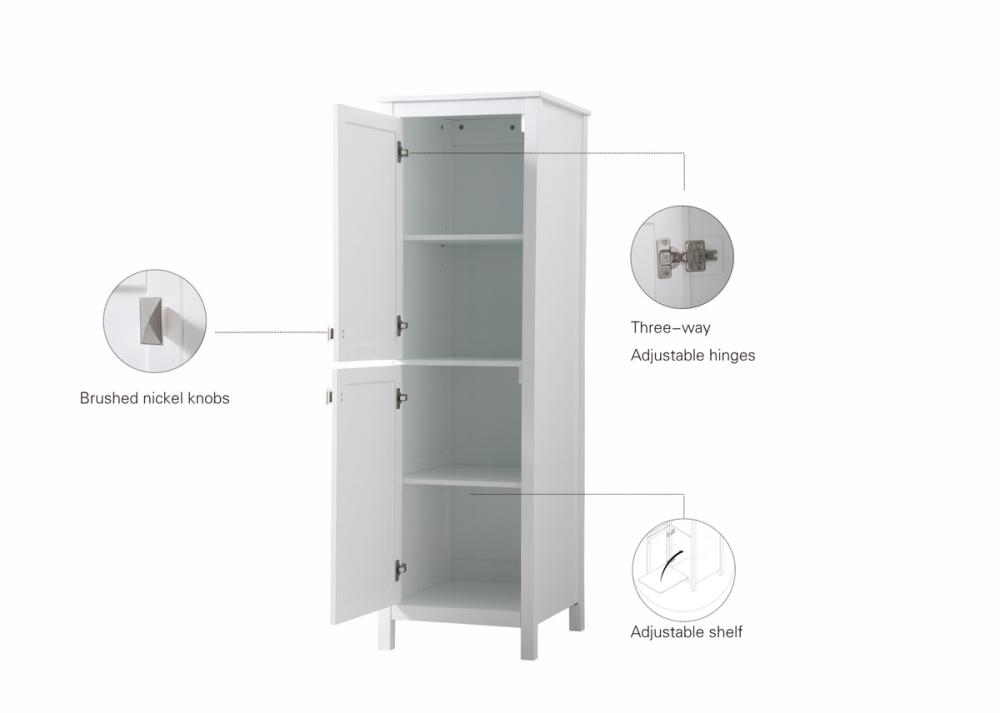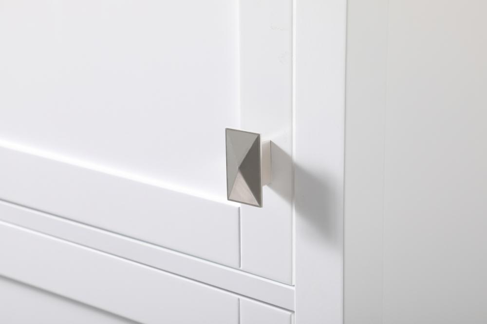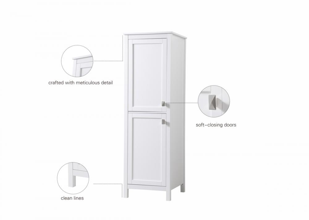 Featuring a sophisticated upper and lower door design, crown molding top, shaker legs, and zinc brushed nickel finish rectangle door knobs, our linen storage cabinet adds a touch of timeless elegance to your space.