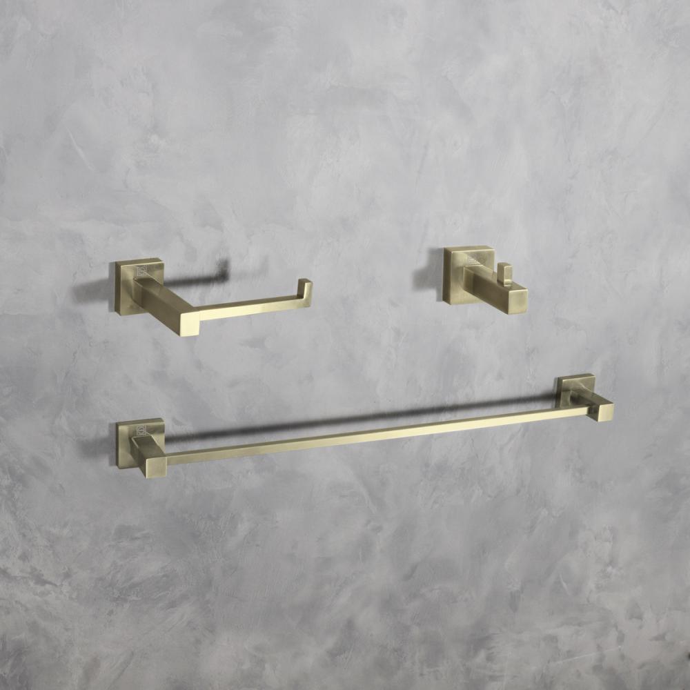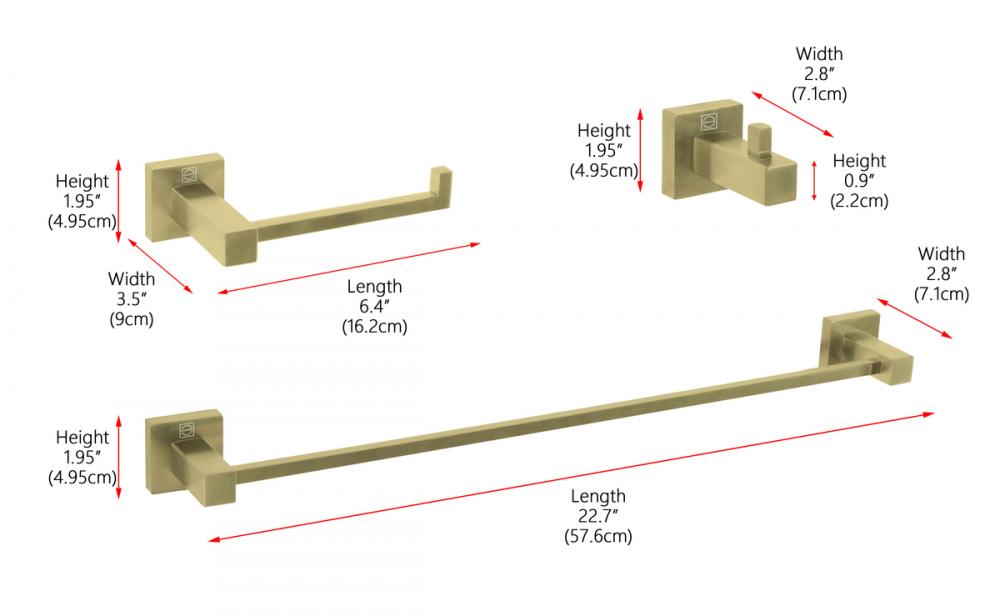 Our Bathroom Hardware Set is all you need to enhance your bathroom. It includes a generous 22.5" long towel bar, a practical 6.3" open-ended toilet paper holder, and a handy 2.83" towel/robe hook.