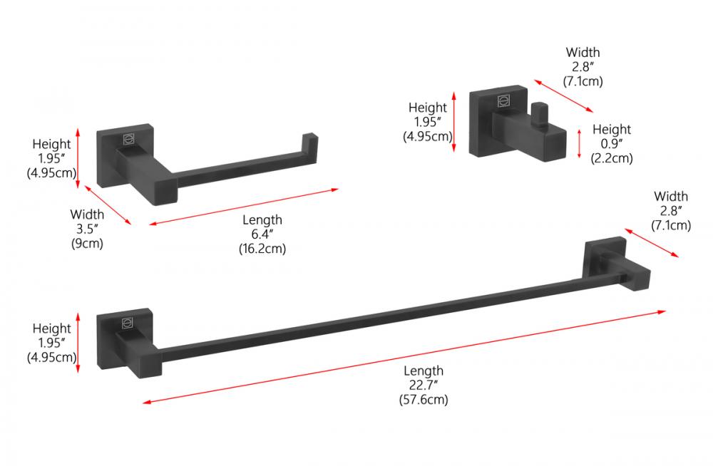 Our Bathroom Hardware Set is all you need to enhance your bathroom. It includes a generous 22.5" long towel bar, a practical 6.3" open-ended toilet paper holder, and a handy 2.83" towel/robe hook.