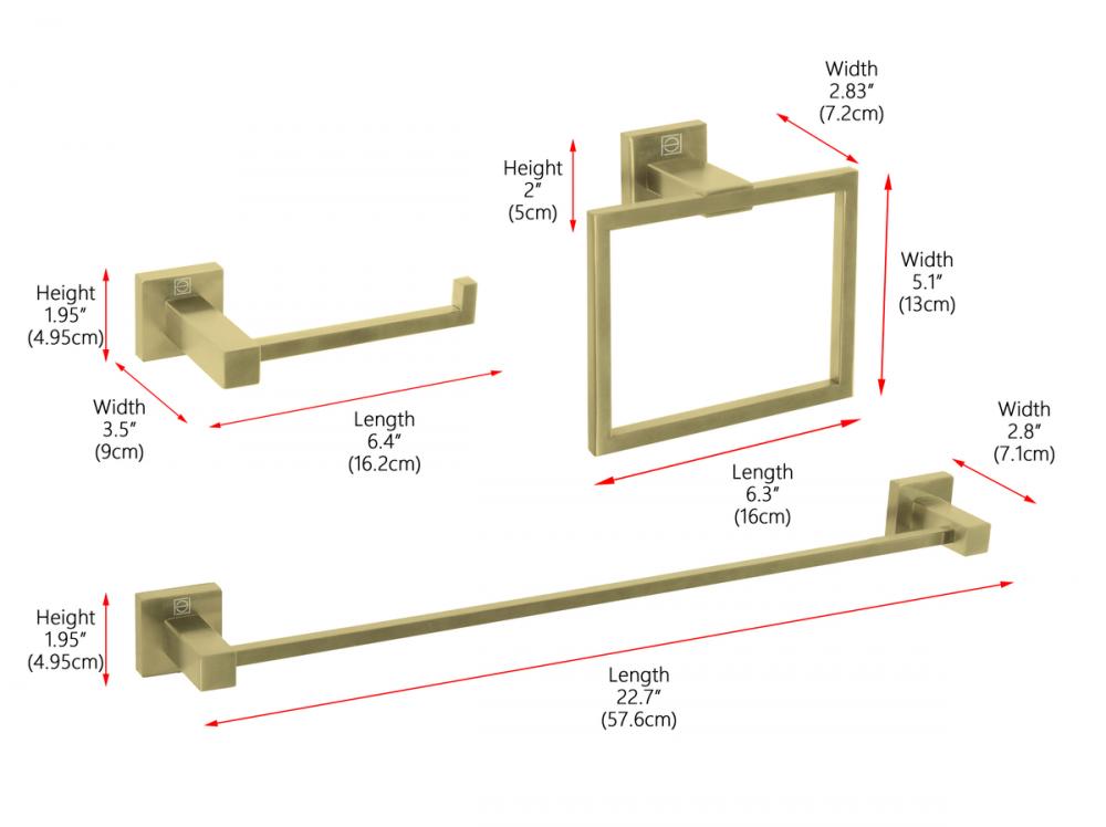 This comprehensive bathroom hardware set includes a 22.7" long towel bar, a 6.4" long open-ended toilet paper holder, and a practical 6.3" towel ring, offering a complete solution for your bathroom needs.