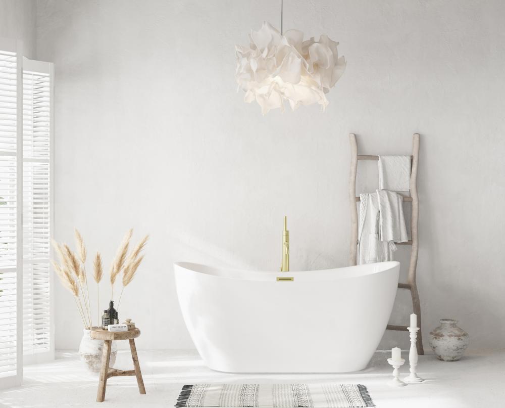 The bathtub comes equipped with a 47-inch drain tube that attaches seamlessly to a 2.7-inch drain, with customizable drain trim finishes including brushed gold, brushed nickel, matte black, chrome, and polished white to complement your bathroom decor.