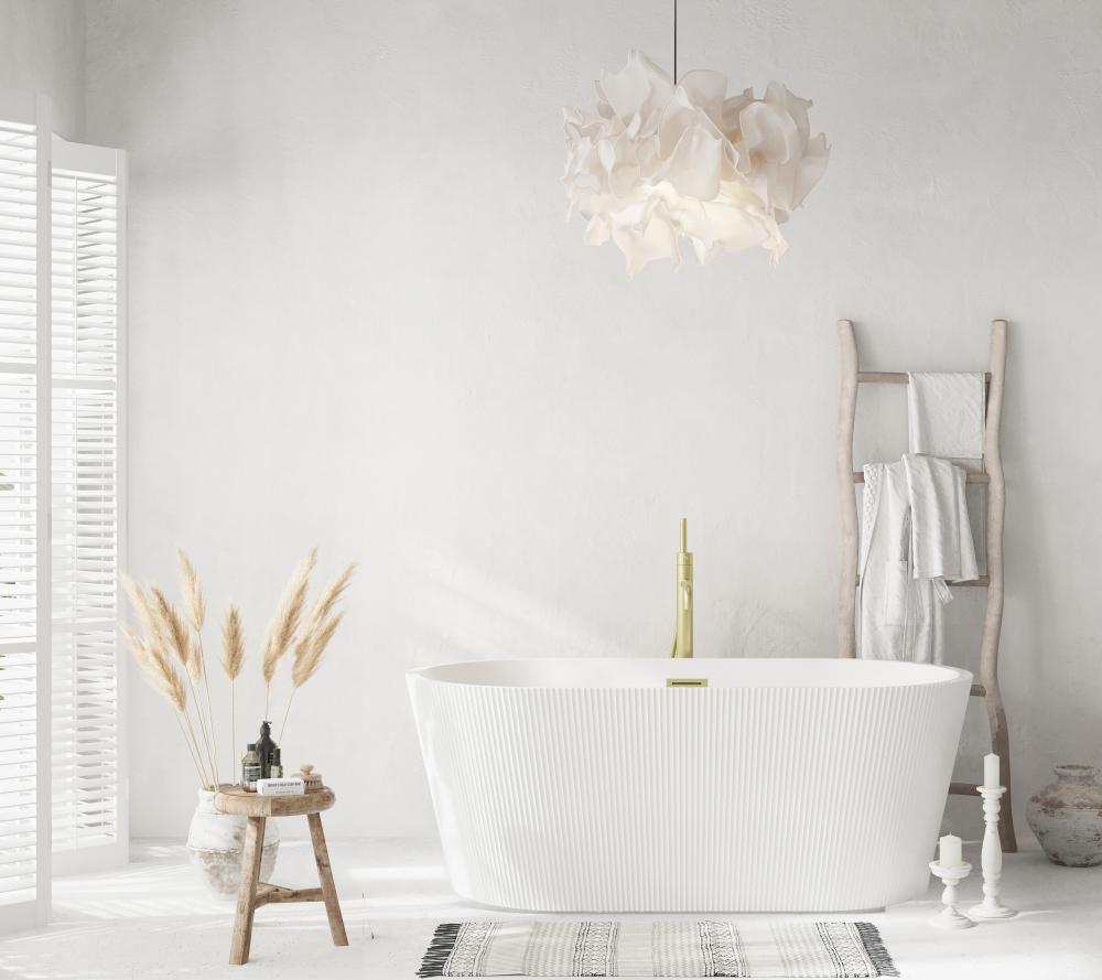 Immerse yourself in the ultimate relaxation experience with this elegant freestanding soaking bathtub, featuring a beautifully textured vertical fluted design that adds a touch of sophistication to your bathroom. The smooth, rounded rim offers comfortable arm support, making it the ideal spot to unwind. Equipped with a pop-up drain and integrated overflow, this tub seamlessly combines convenience and style. with a generous capacity and 15-inch soaking depth, it's perfect for those looking to indulge in a deep, luxurious soak. Available with customizable drain trim finishes like brushed gold, matte black, and more, this bathtub is designed to fit your unique style. Durable and easy to install with adjustable foot levelers, this tub is both a statement piece and a functional retreat in your home.
