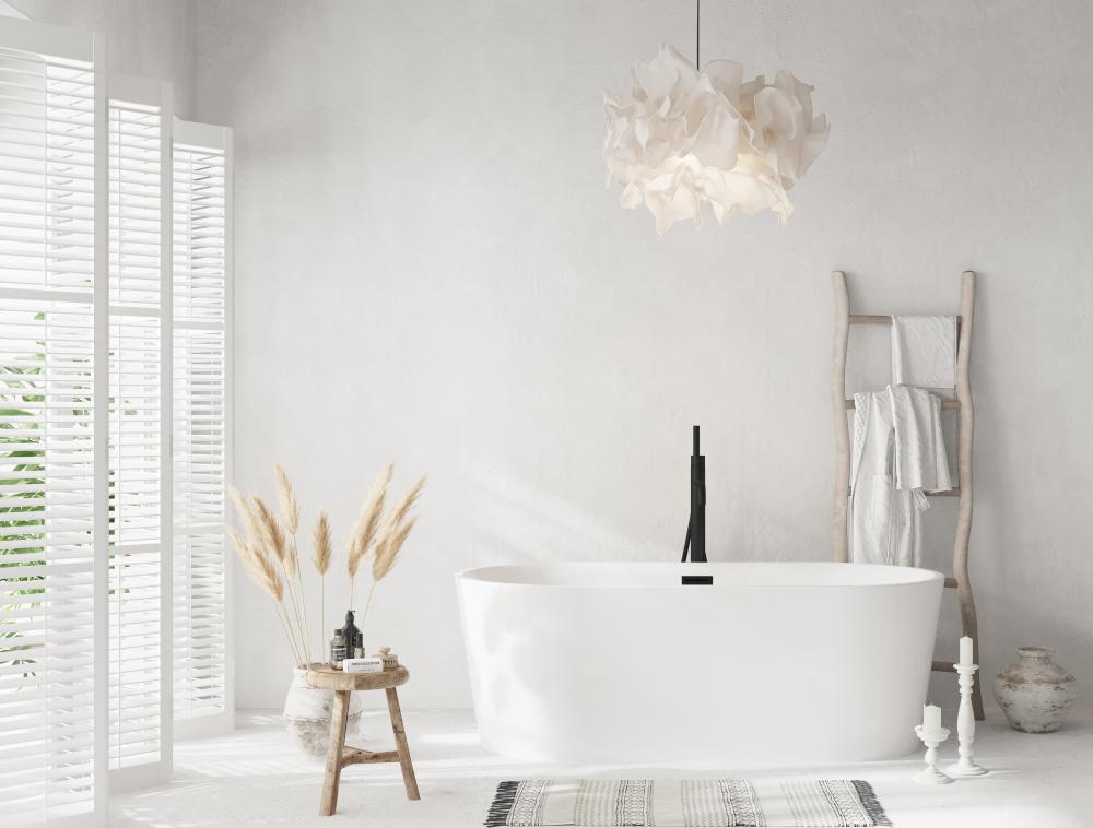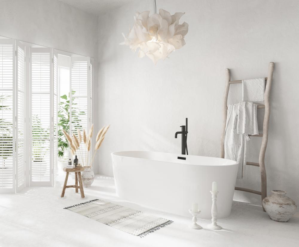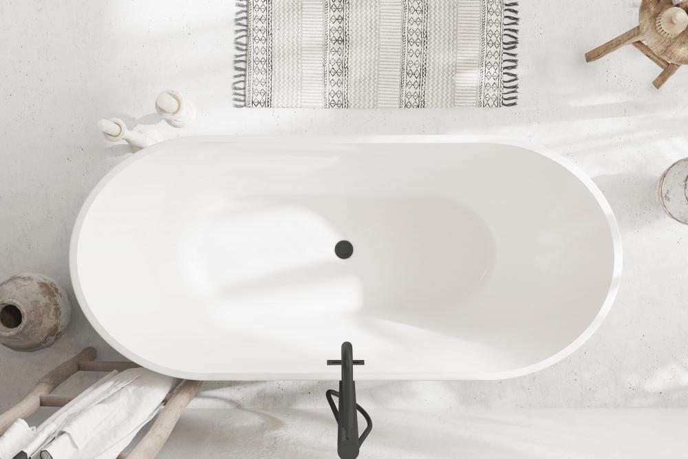 A double-ended freestanding bathtub offers symmetry and luxury. Both ends are gently sloped, allowing for comfortable reclining from either side.