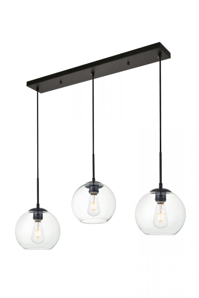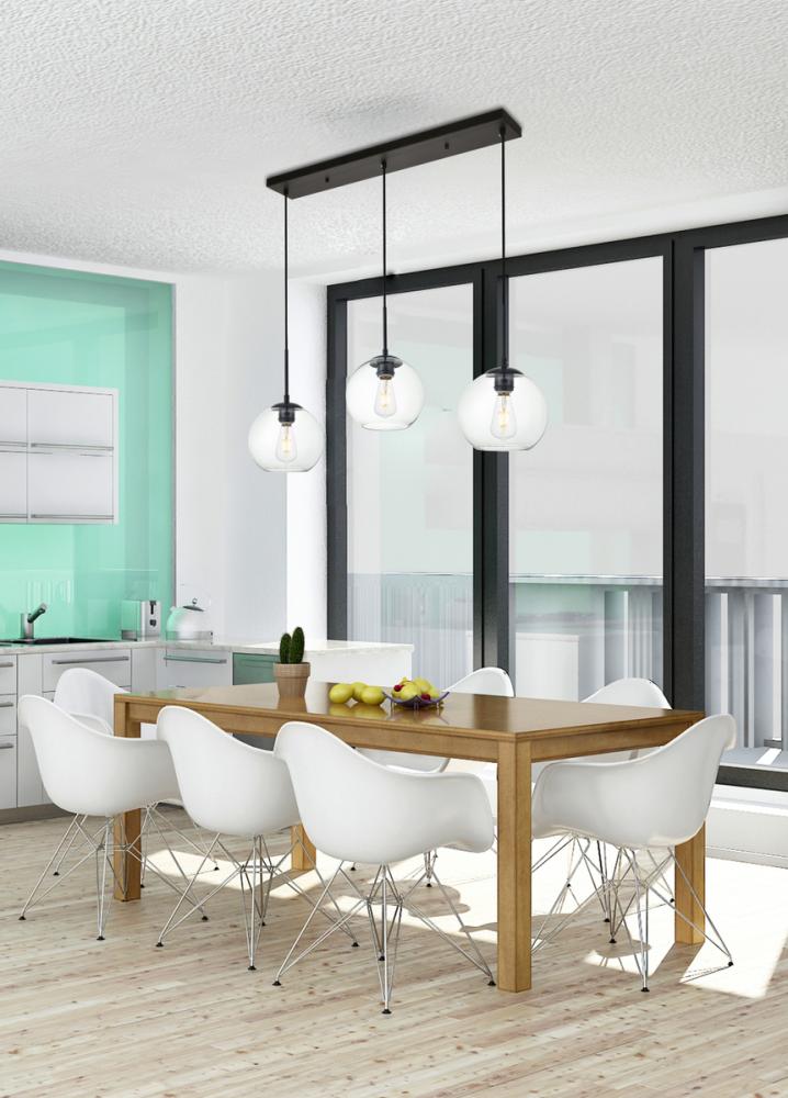 Refined style with a practical design, Baxter hanging pendant lamps bring cosmopolitan sophistication anywhere, especially to an entryway, office, bathroom, bedroom, or kitchen. The smooth iron frame features a rectangular canopy and comes in a black finish. Adjustable black cords allow you to vary the hanging height from 14 to 87 inches. A row of three identical clear spherical glass shades remain open at the center to allow for effortless replacement of the filament-style bulbs (not included). Living in the big city has never been this easy.