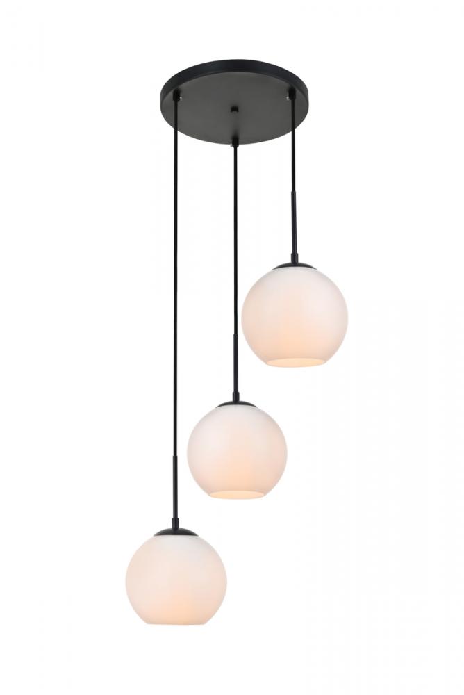 Refined style with a practical design, Baxter hanging pendant lamps bring cosmopolitan sophistication anywhere, especially to an entryway, office, bathroom, bedroom, or kitchen. The smooth iron frame features a disk-shaped canopy and comes in a black finish. Adjustable black cords allow you to modify the hanging height from 14 to 87 inches. Three identical frosted white spherical glass shades are suspended at varying heights and remain open at the center to allow for effortless replacement of the filament-style bulbs (not included). Living in the big city has never been this easy.