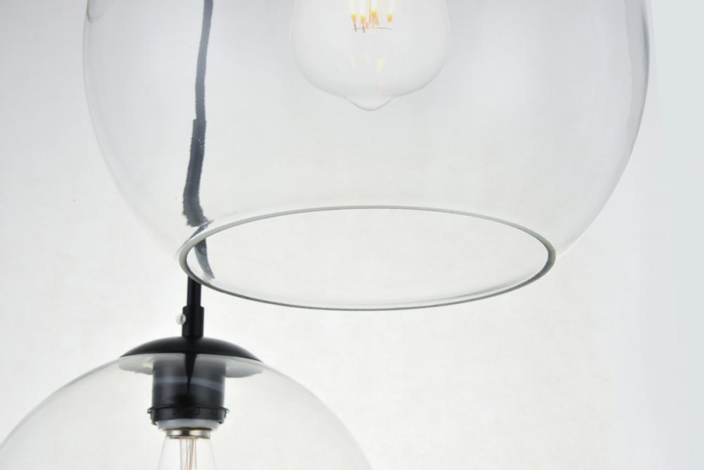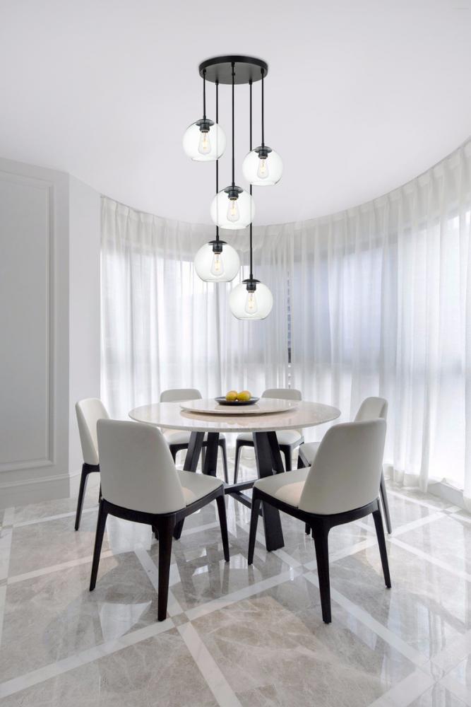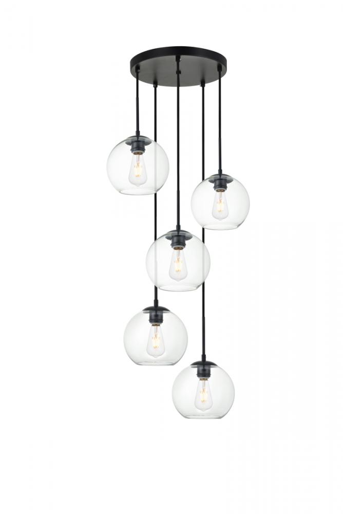 Refined style with a practical design, Baxter hanging pendant lamps bring cosmopolitan sophistication anywhere, especially to an entryway, office, bathroom, bedroom, or kitchen. The smooth iron frame features a disk-shaped canopy and comes in a black finish. Adjustable black cords allow you to modify the hanging height from 14 to 87 inches. Five identical clear spherical glass shades are suspended at varying heights and remain open at the center to allow for effortless replacement of the filament-style bulbs (not included). Living in the big city has never been this easy.
