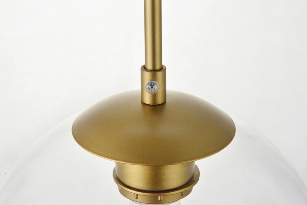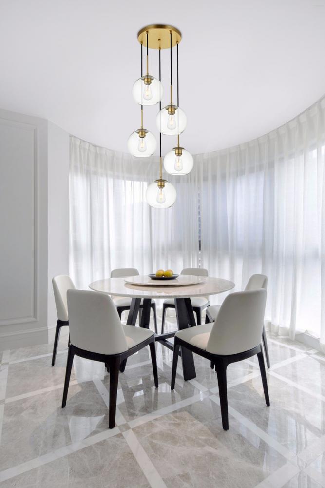 Refined style with a practical design, Baxter hanging pendant lamps bring cosmopolitan sophistication anywhere, especially to an entryway, office, bathroom, bedroom, or kitchen. The smooth iron frame features a disk-shaped canopy and comes in a brass finish. Adjustable black cords allow you to modify the hanging height from 14 to 87 inches. Five identical clear spherical glass shades are suspended at varying heights and remain open at the center to allow for effortless replacement of the filament-style bulbs (not included). Living in the big city has never been this easy.