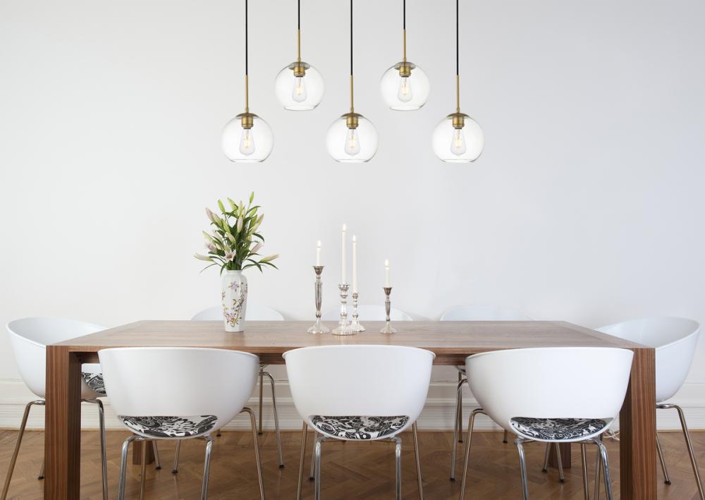 Refined style with a practical design, Baxter hanging pendant lamps bring cosmopolitan sophistication anywhere, especially to an entryway, office, bathroom, bedroom, or kitchen. The smooth iron frame features a rectangular canopy and comes in a brass finish. Adjustable black cords allow you to vary the hanging height from 14 to 87 inches. Two staggered rows of five identical clear spherical glass shades remain open at the center to allow for effortless replacement of the filament-style bulbs (not included). Living in the big city has never been this easy.