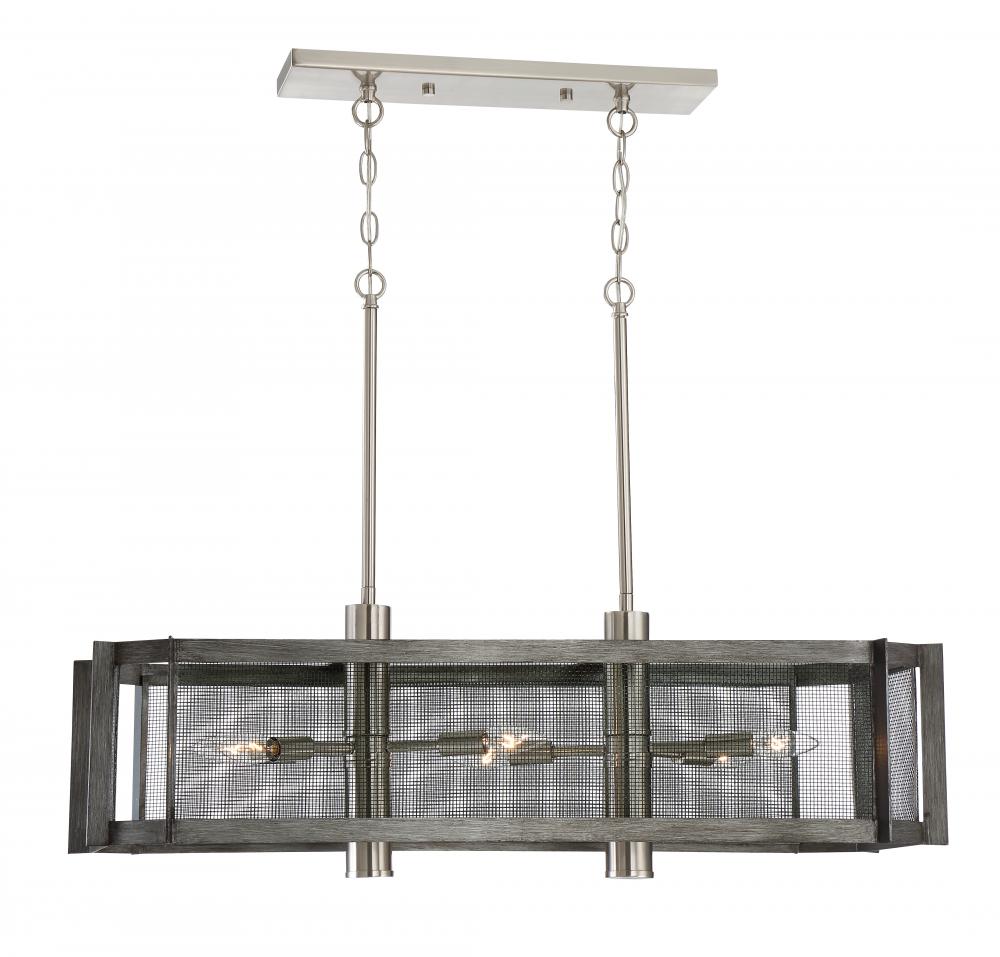 Baxter combines both rustic industrial design and modern appeal. A perforated mesh shade, hand painted in a modeled Weathered Iron finish, suspends from sleek Satin Platinum center columns. The perforated mesh shade allows the Satin Platinum center columns to be highlighted, adding a sense of sophistication while paying homage to an era.