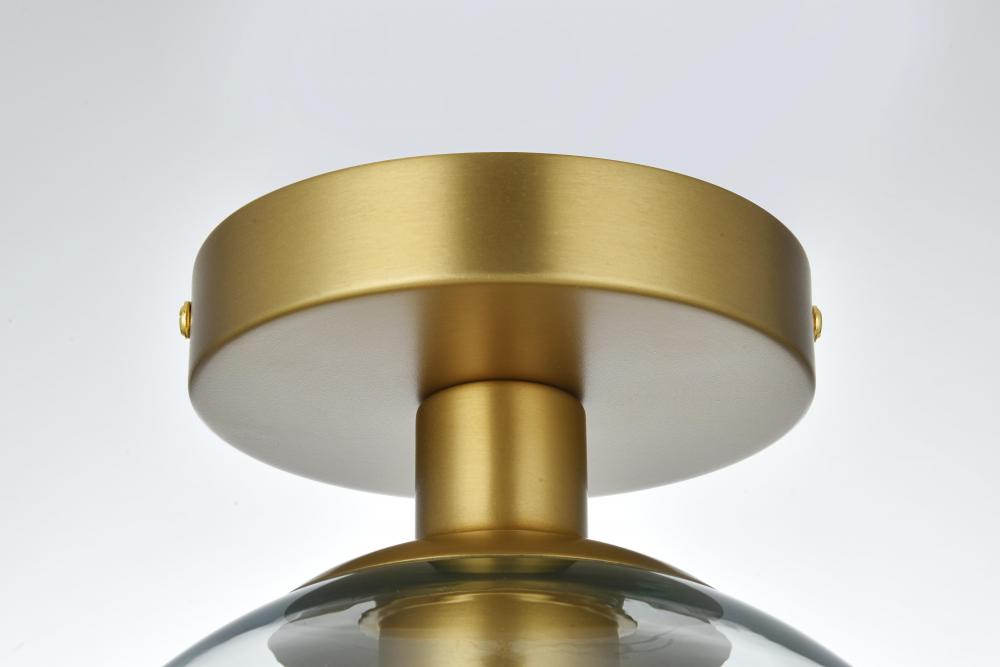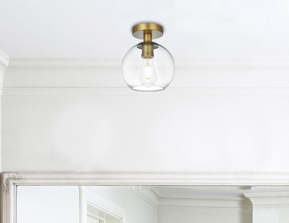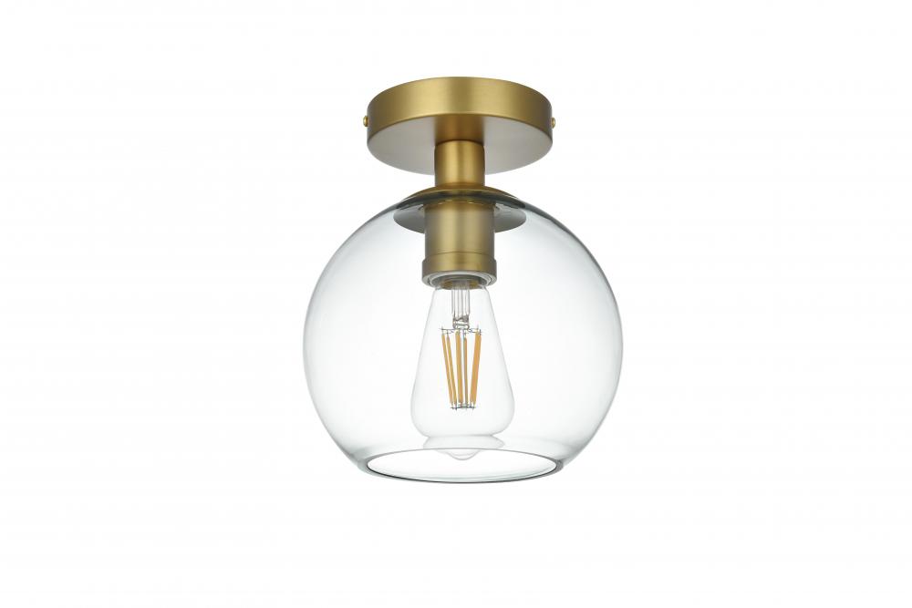 Baxter flush mount ceiling lamps deliver cosmopolitan sophistication through a refined yet practical design, perfect for enhancing any space—whether it's an entryway, hallway, bathroom, kitchen, or closet. The smooth iron frame features a disk-shaped canopy finished in sleek satin gold, paired with a clear spherical glass shade that remains open at the center for effortless bulb replacement. The filament-style bulb (not included) complements the timeless charm. Bringing big-city elegance into your home has never been simpler.