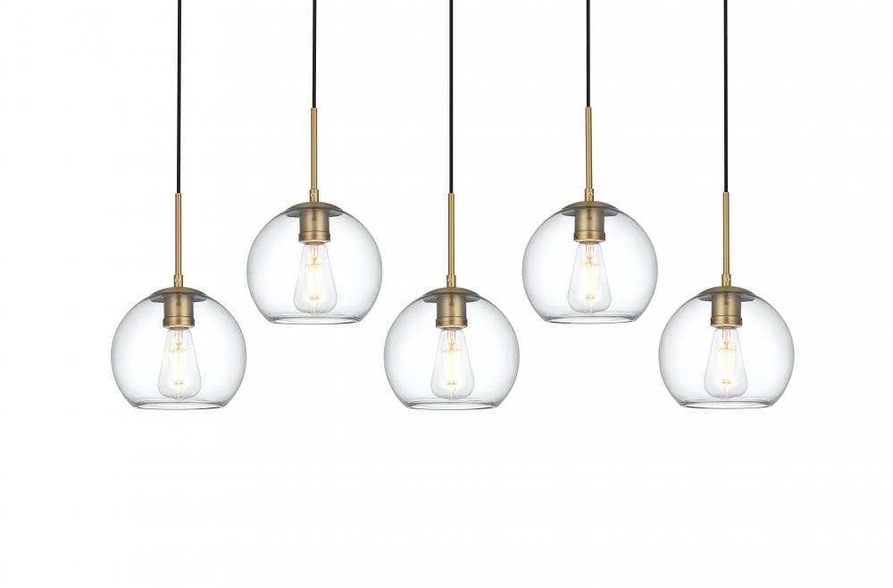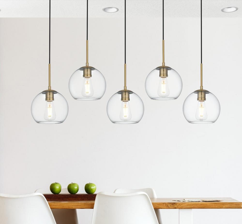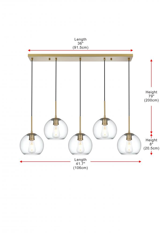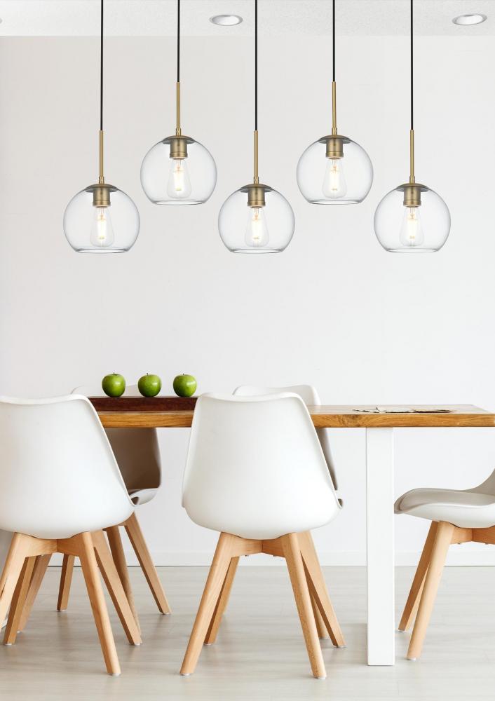 The Baxter hanging pendant light combines refined style with a practical design, adding cosmopolitan sophistication to any space—be it an entryway, hallway, bathroom, kitchen, or closet. The sleek iron frame, complete with a rectangular canopy, elegantly supports five clear spherical glass shade that stays open at the center, making bulb replacement effortless. Designed for those who love the look of big-city elegance, the Baxter pendant makes sophisticated living easy.