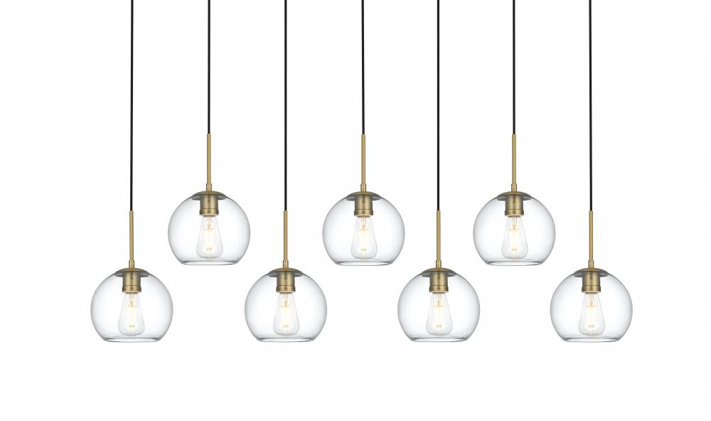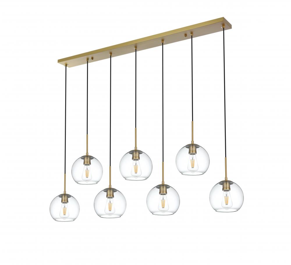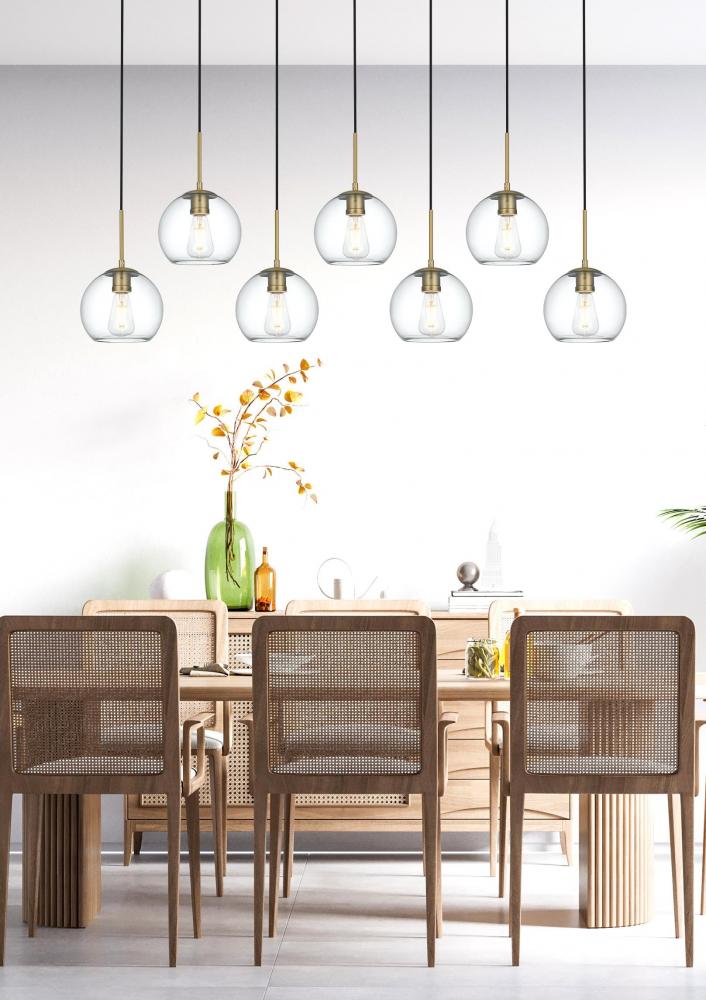 The Baxter hanging pendant light combines refined style with a practical design, adding cosmopolitan sophistication to any space—be it an entryway, hallway, bathroom, kitchen, or closet. The sleek iron frame, complete with a rectangular canopy, elegantly supports seven clear spherical glass shade that stays open at the center, making bulb replacement effortless. Designed for those who love the look of big-city elegance, the Baxter pendant makes sophisticated living easy.