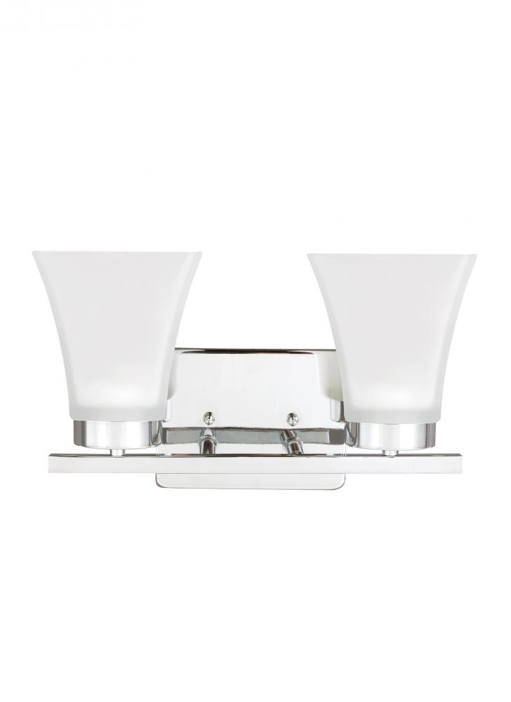 The Bayfield two light vanity fixture in chrome is an ENERGY STARĀ® qualified lighting fixture that uses LED bulbs to save you both time and money. The Bayfield bath collection by delivers simplicity with flair. The transitional design is a subtle combination of clean lines and flared, angular Satin Etched glass shades to bring style and warmth to the bathroom no matter the budget. Offered in Chrome, Burnt Sienna and Brushed Nickel finishes, the bath lighting collection offers one-light, two-light, three-light and four-light vanity fixtures. Both incandescent lamping and ENERGY STAR-qualified LED lamping are available; all fixtures are California Title 24 compliant.