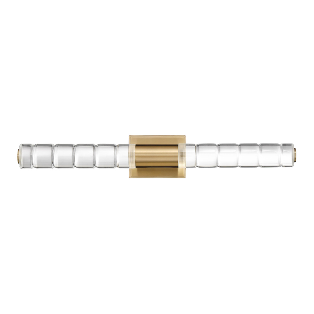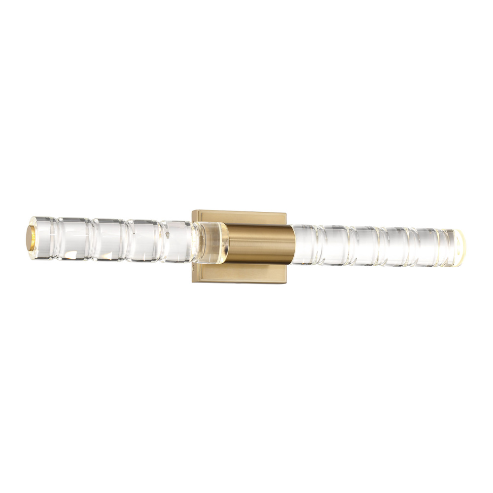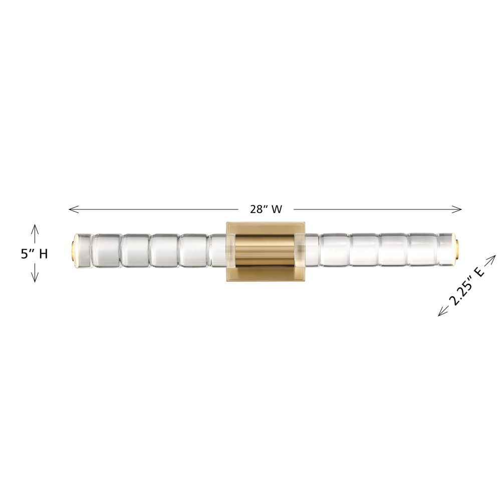 Highly textured batons of K9 crystal draw the eye and shine brightly in the Savoy House Beale LED wall sconce. The crystal takes center stage, held in an understated structure that is decorated in a chic Noble Brass finish. This edgy style is a perfect way to illuminate a bath vanity, piece of art, hallway, living room, bedside table or any other space you can imagine! Beale is 5" in height, 28" in width and extends 4.5" from the wall. It uses integrated LED light sources.