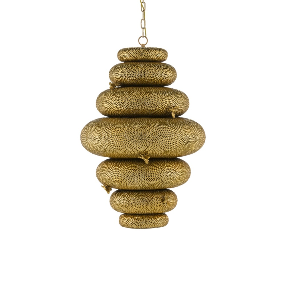 The Bee My Honey Chandelier, designed by Sasha Bikoff, is guaranteed to be a playful element in an interior. Made of wrought iron in an antique brass finish, the gold chandelier is handmade using a technique called metal piercing, a process during which composite is poured into the cavity of a mold and intricately pierced using a nail-shaped piece of metal. The textural stippling creates the feeling of a hive around which cast bees have been welded. Adjustable from 38" to 106" with use of included chain/rod kit/cable. If your space calls for a longer drop, additional chain/rods/cable is available for purchase.