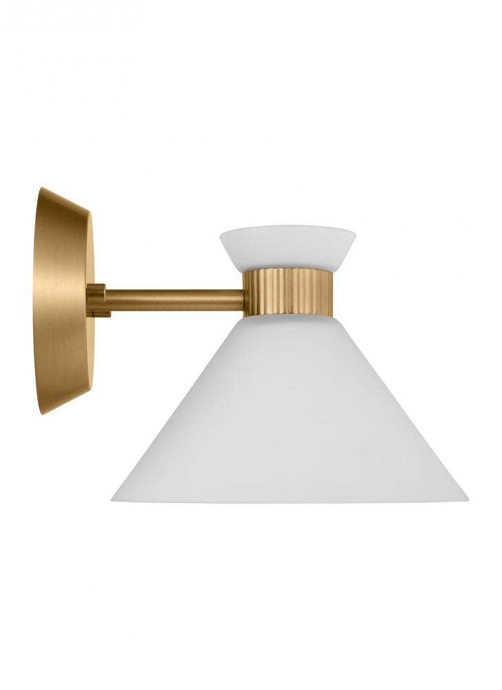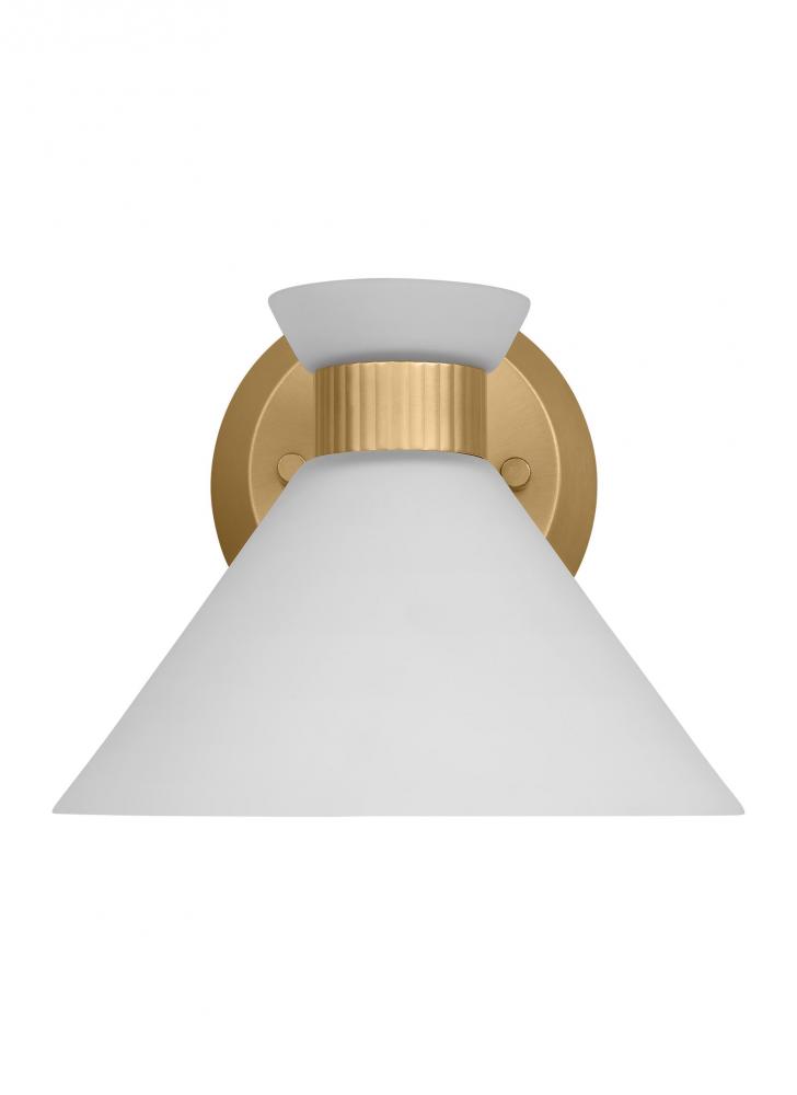 The flared glass shade with ribbed metal details and etched white glass of this light bring clean lines and classic mid-century modern design to any wall or bath space